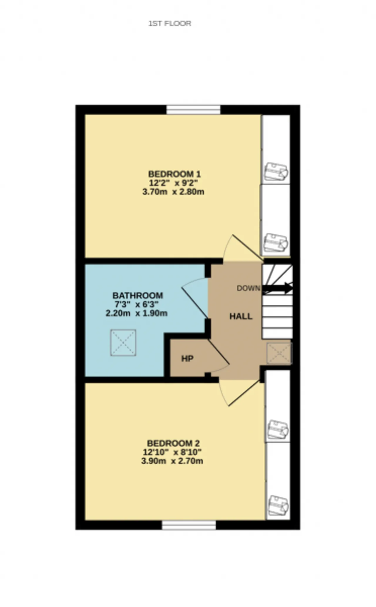 Bedroom 2 2.70m x 3.90m Double bedroom with engineered wooden flooring, built-in wardrobes and a ceiling rose.