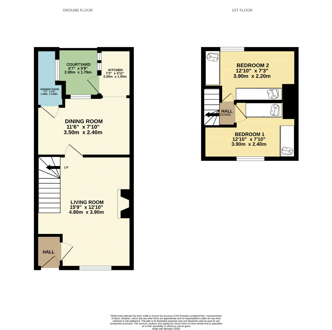 Upstairs, you’ll find two inviting bedrooms. Bedroom One at the front of the property boasts a charming sash window, two built-in wardrobes and warm wooden floors. The second bedroom at the rear also features wooden floors, a built-in wardrobe and additional storage perfect for family or guests.