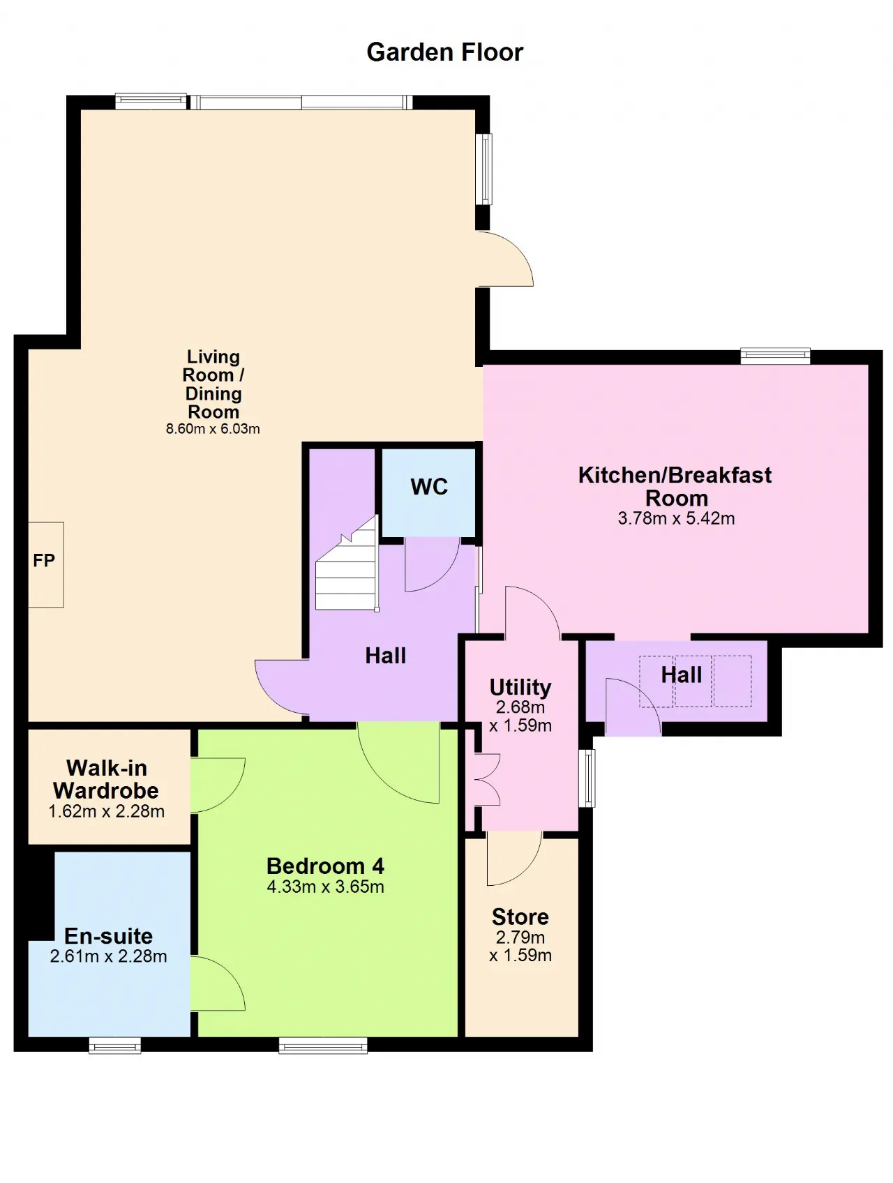 Sitting/Dining room: With continued wood flooring, dual aspect dining area with floor to ceiling windows overlooking rear garden and glazed patio door to side patio and garden. Pitched skylight roof overhead dining area. Sitting room with original cast iron fireplace.
