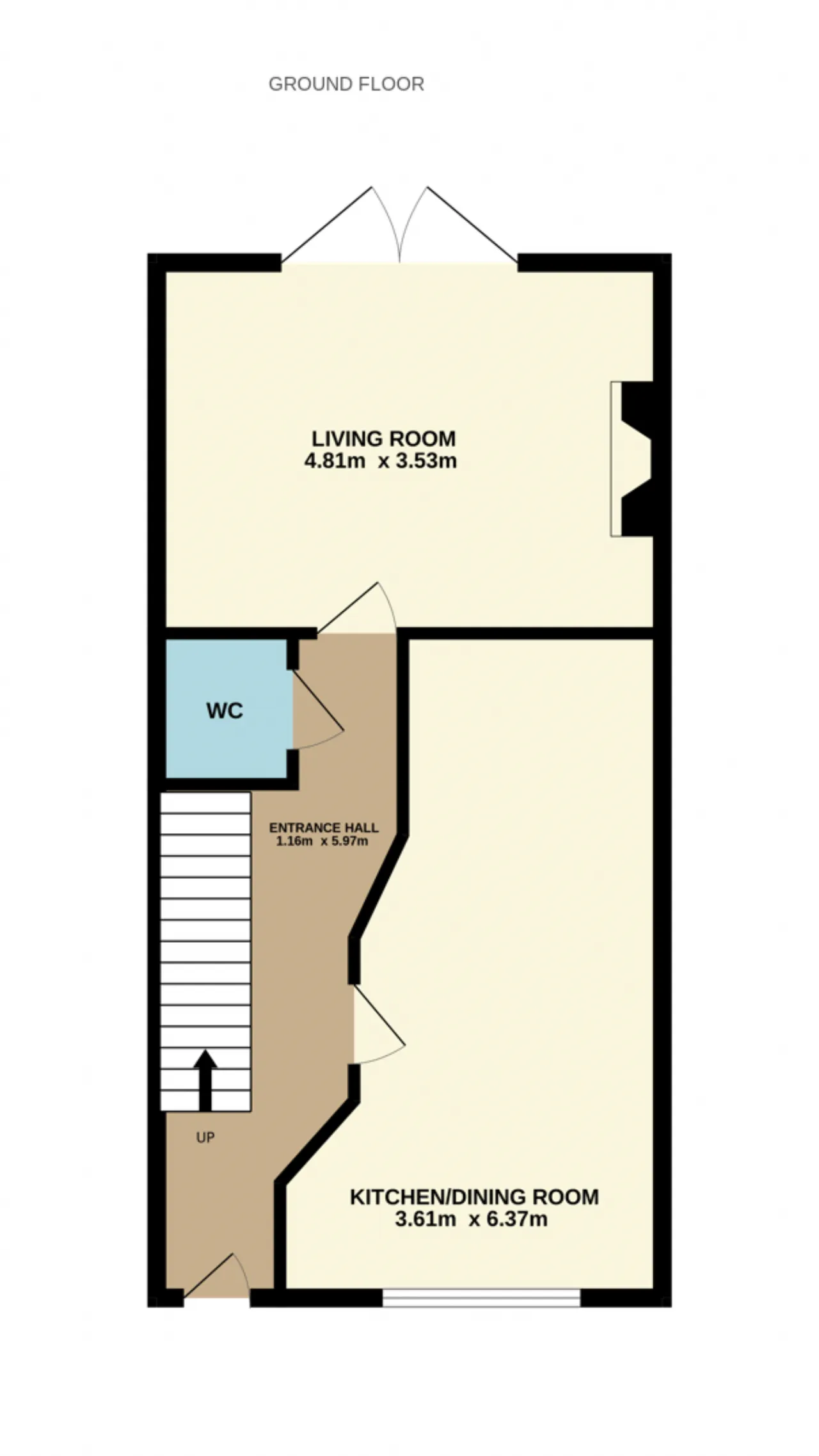 Living Room 4.81m x 3.53m Laminate wood flooring, polished stone fireplace with coal effect gas fire, ceiling coving and French doors to rear.