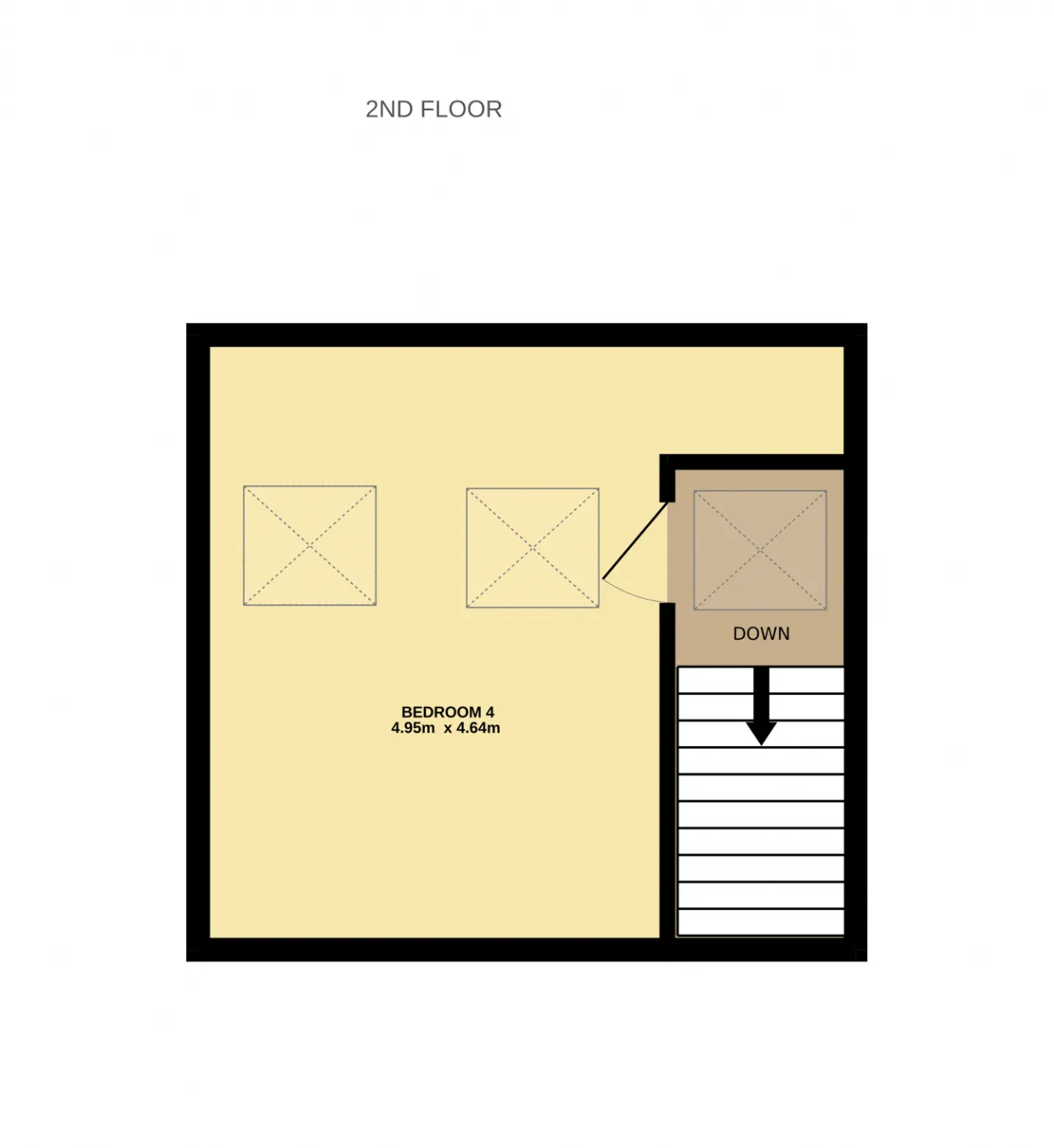 Attic 4.95m x 4.64m Laminate wood flooring, under eaves storage and two velux windows.
