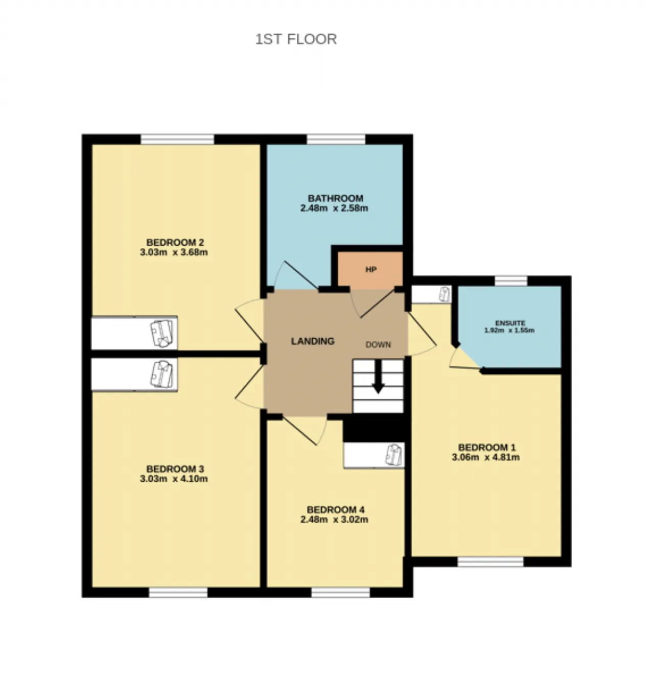 Bedroom 4 2.48m x 3.02m Single bedroom currently in use as a home office with laminate wood flooring, fitted wardrobes, window to front with window shutters.