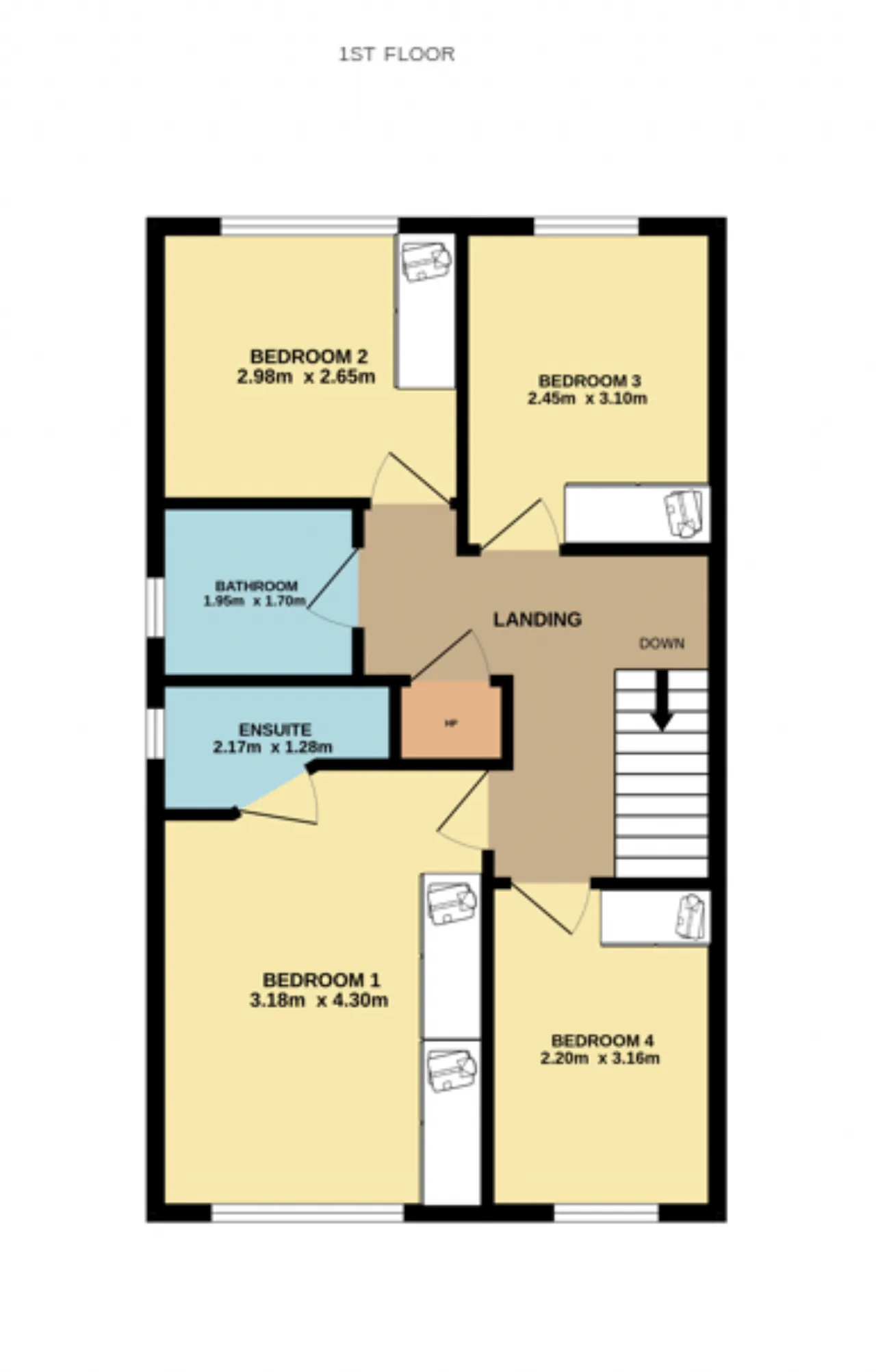 Bedroom 1 3.20m x 4.3m Double bedroom with laminate wood flooring, fully fitted wardrobes and window over-looking front.