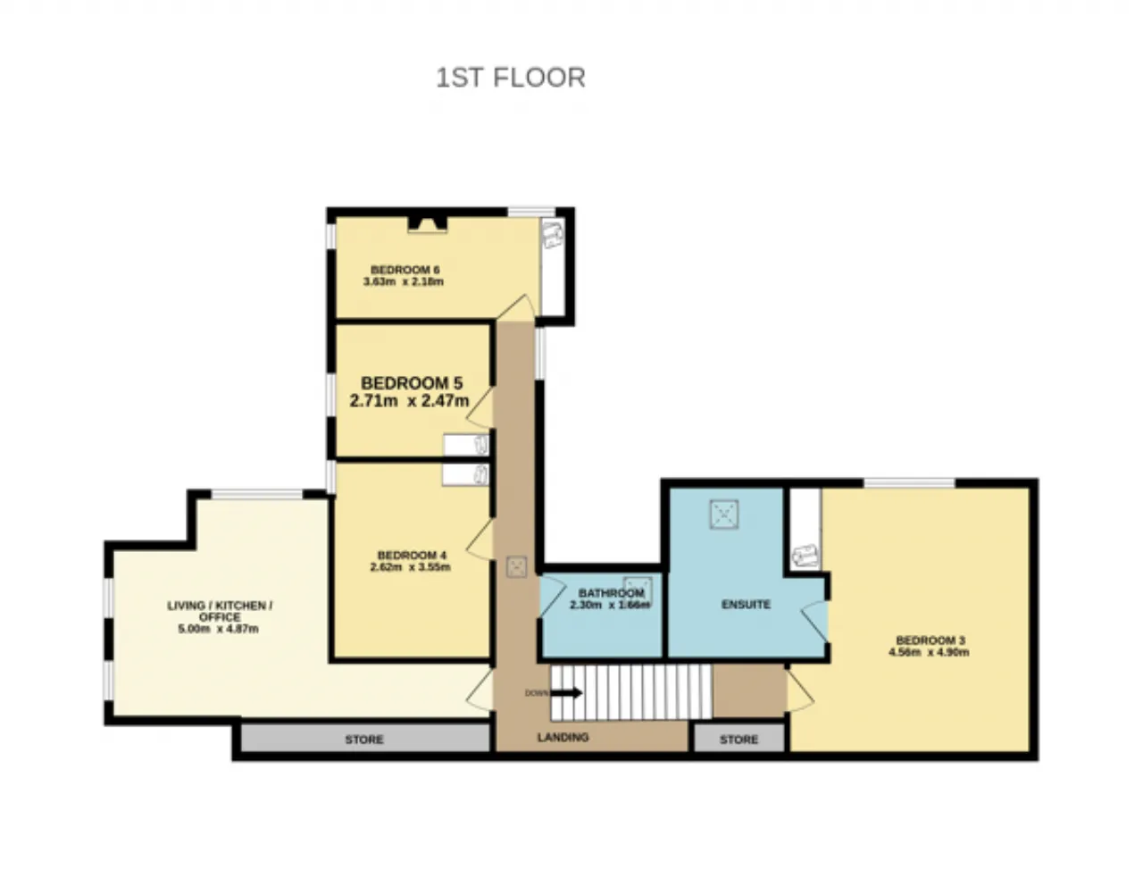 Princple Bedroom 4.55m x 3.61m This impressive bedroom spans the front to the back of the house and boasts a triple aspect, capturing light and views from the front, back, and side. It’s a spacious double room with an ensuite shower room and a large dressing area featuring extensive wardrobes.