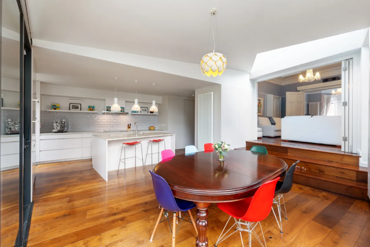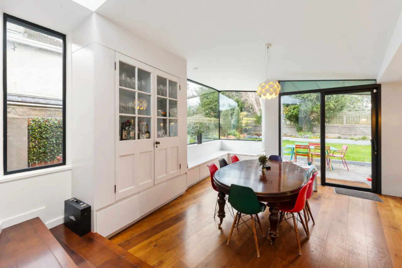 Dining Room 4.47m x 5.85m Fabulous extended open plan room with wideplank wooden flooring and feature corner window with window seating and under-storage. There is large fitted drinks cabinet where the original doors from the dining room have been re-purposed. A substantial skylight allows for a wonderful flow of natural light. Sliding doors open out into the rear garden.