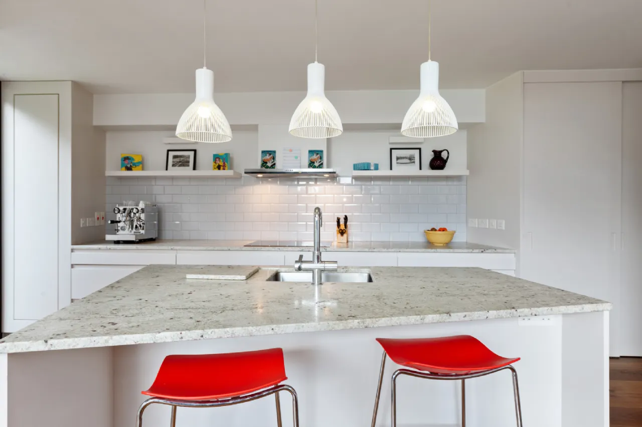 To the rear you will find a light filled and open plan kitchen / dining area - the bespoke Darren Langrell kitchen and island being a real feature and centre piece. Located off the kitchen is a functional utility press and a separate Guest WC. The kitchen and dining area are bathed in natural light which floods in via a large roof light with the dining area featuring a fitted drinks cabinet and interconnecting with the cosy family room via hardwood timber steps. Upstairs does not disappoint, the layout is versatile and perfectly suited to family living with 4 bedrooms and 2 generous bathrooms. Bedrooms 1 & 2 boast bespoke fitted wardrobes, and the main bathroom is generous in size with ample storage. There is a well appointed office area in the landing, perfect for those who work from home.