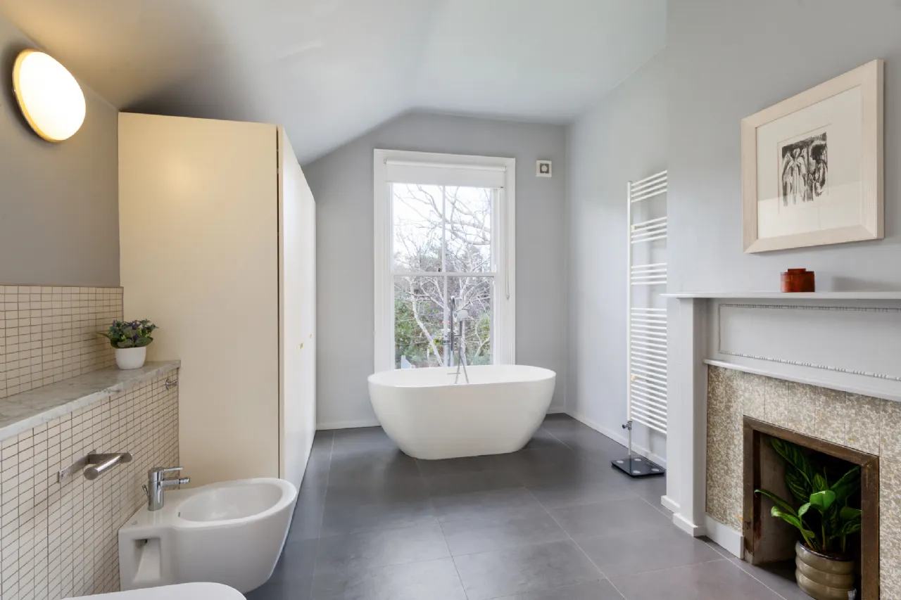 Bathroom 3.10m x 4.75m Large family bathroom with tiled floor, wash hand basin, toilet, bidet and tiled splashback. Free standing bath with shower attachment and fully tiled shower cubicle with overhead rain shower. Fitted linen press and storage. Original sash window overlooks the rear garden and fireplace with wooden surround and tiled inset. Heated towel rail.