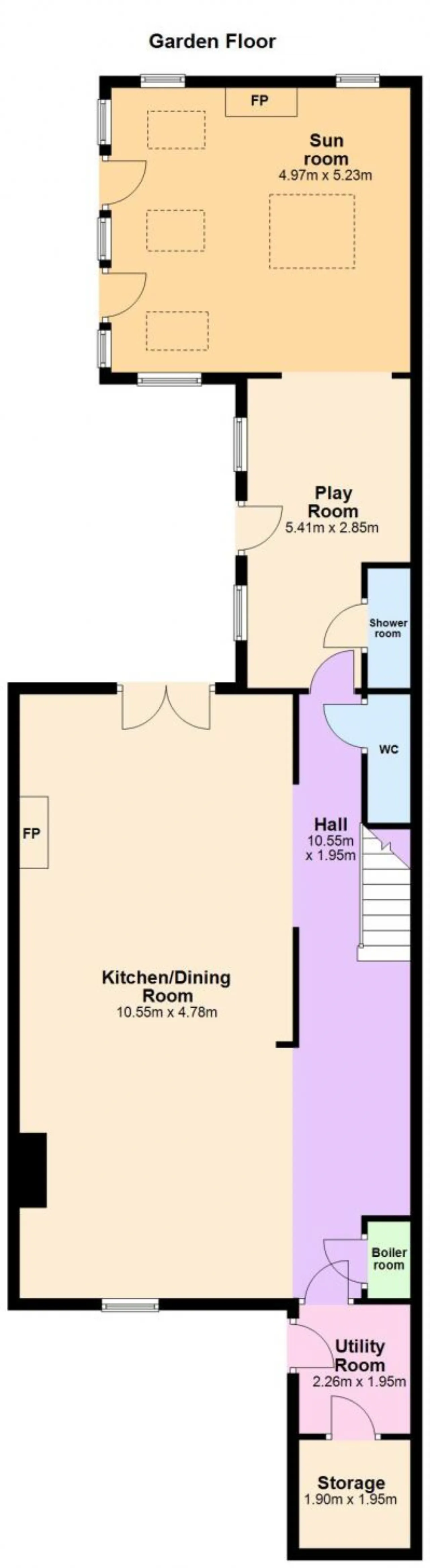 Sunroom 4.97m x 5.23m Timber flooring, high ceiling, atrium skylight, feature open fireplace with brick surround and stove inset, windows to rear, double doors to garden.