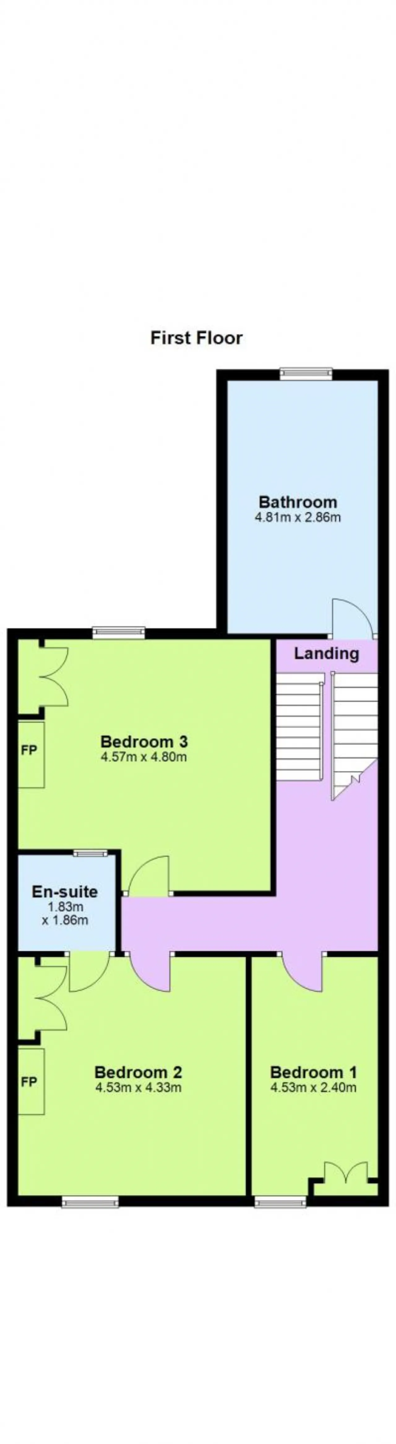 Bedroom 3 4.57m x 4.80m Double room, sash window with functioning shutters to rear, feature open fireplace.