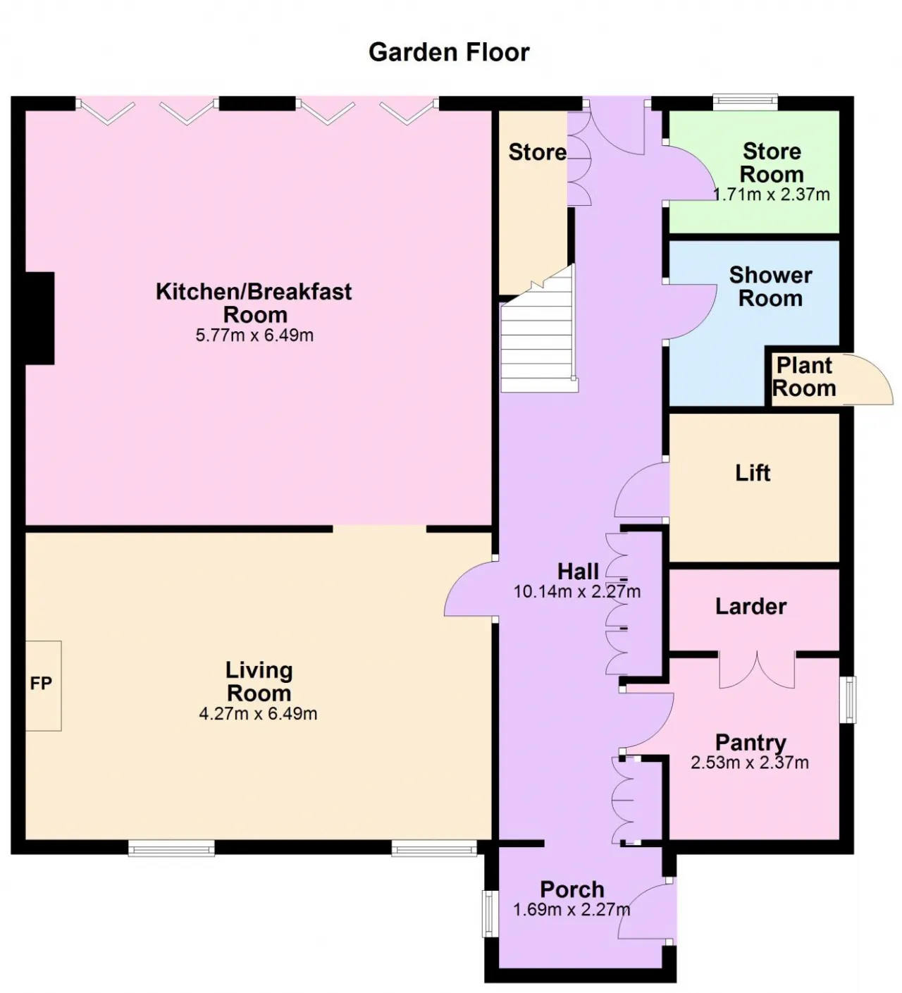 Entrance Hallway Sash window, hardwood flooring, cloakroom, storage, lift, under stair storage with boiler, water tank and pump. Door to rear garden.