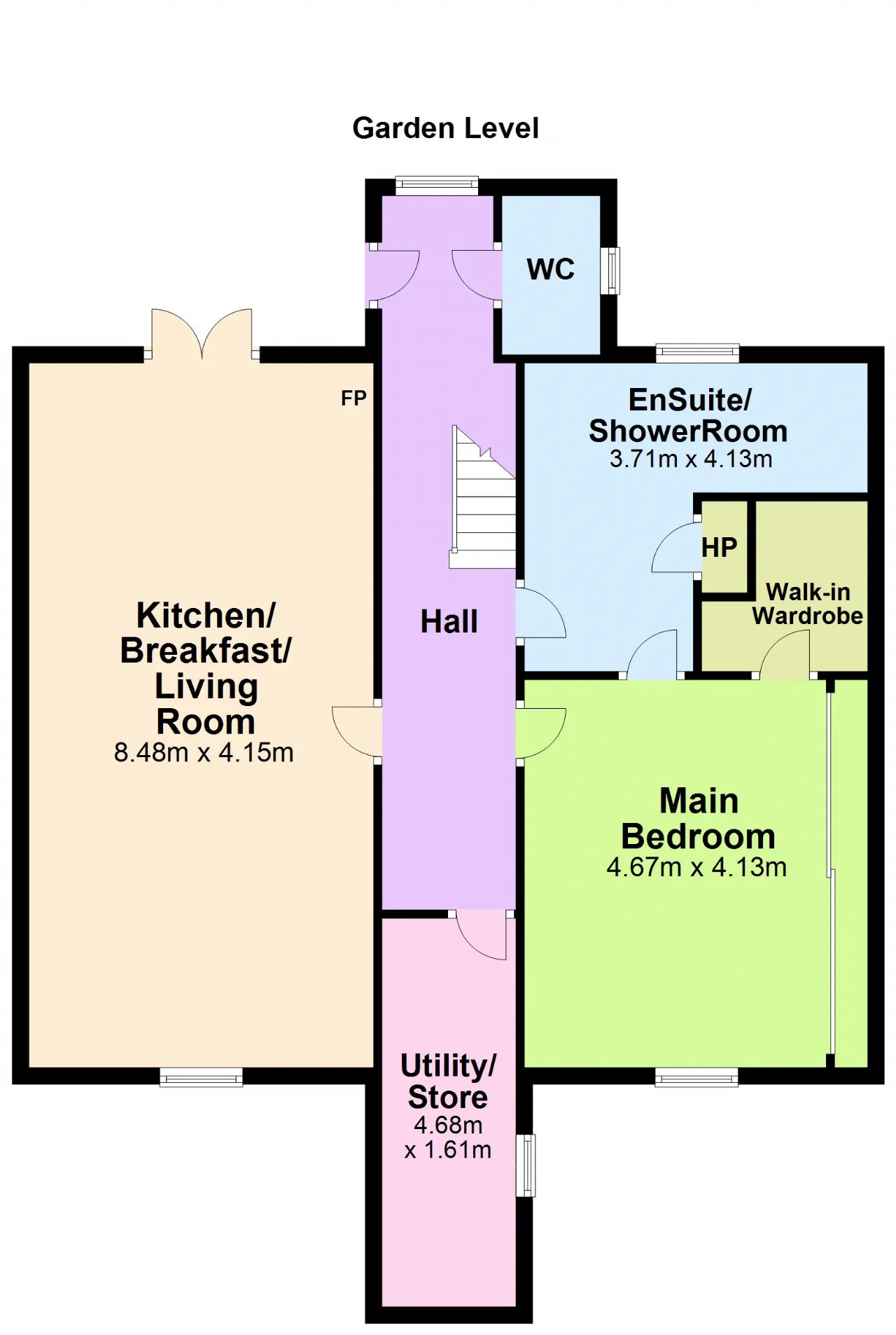 Utility Room 4.68m x 1.61m Tiled floor, plumbed for washing machine and dryer, fitted shelves, wash hand basin inset in vanity unit.
