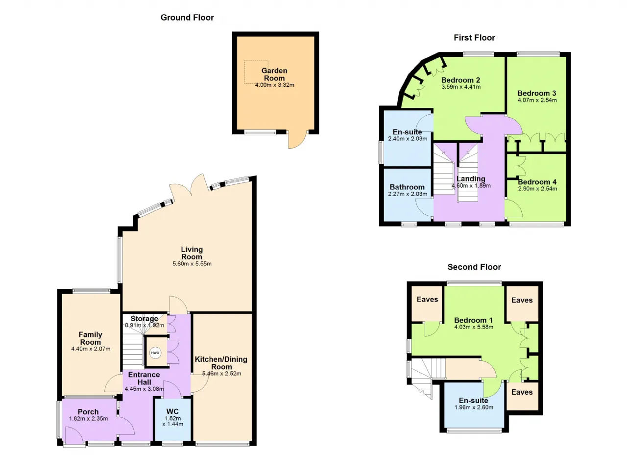Ensuite 2.40m x 2.03m Tiled flooring, partially tiled walls and recessed lighting. White suite incorporating wash hand basin with mirror over, WC, shower cubicle with wall mounted shower. Window and extractor fan. Heated towel rail.