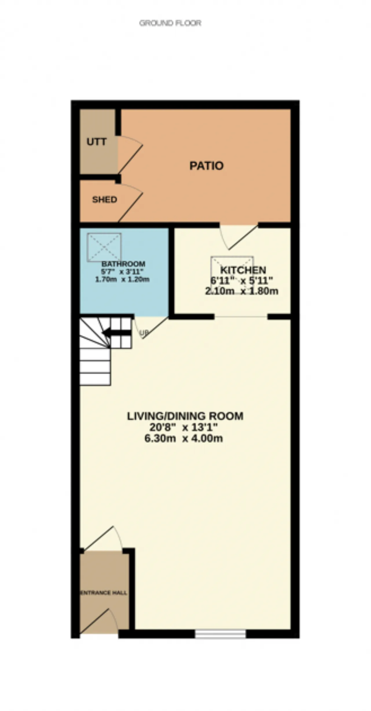 The accommodation comprises a welcoming entrance hall leading into a bright living and dining area with sash windows and shutters, flowing seamlessly into a recently refurbished kitchen. Also on the ground floor is a fully tiled bathroom featuring a south-facing skylight. Upstairs, there are two double bedrooms, a front bedroom and a south-facing rear bedroom with built-in wardrobes, additional storage, and attic access. Outside, the patio area features composite decking with a built-in bench, along with two sheds, one serving as a practical utility area plumbed for a washing machine and fitted with electricity for a dryer.