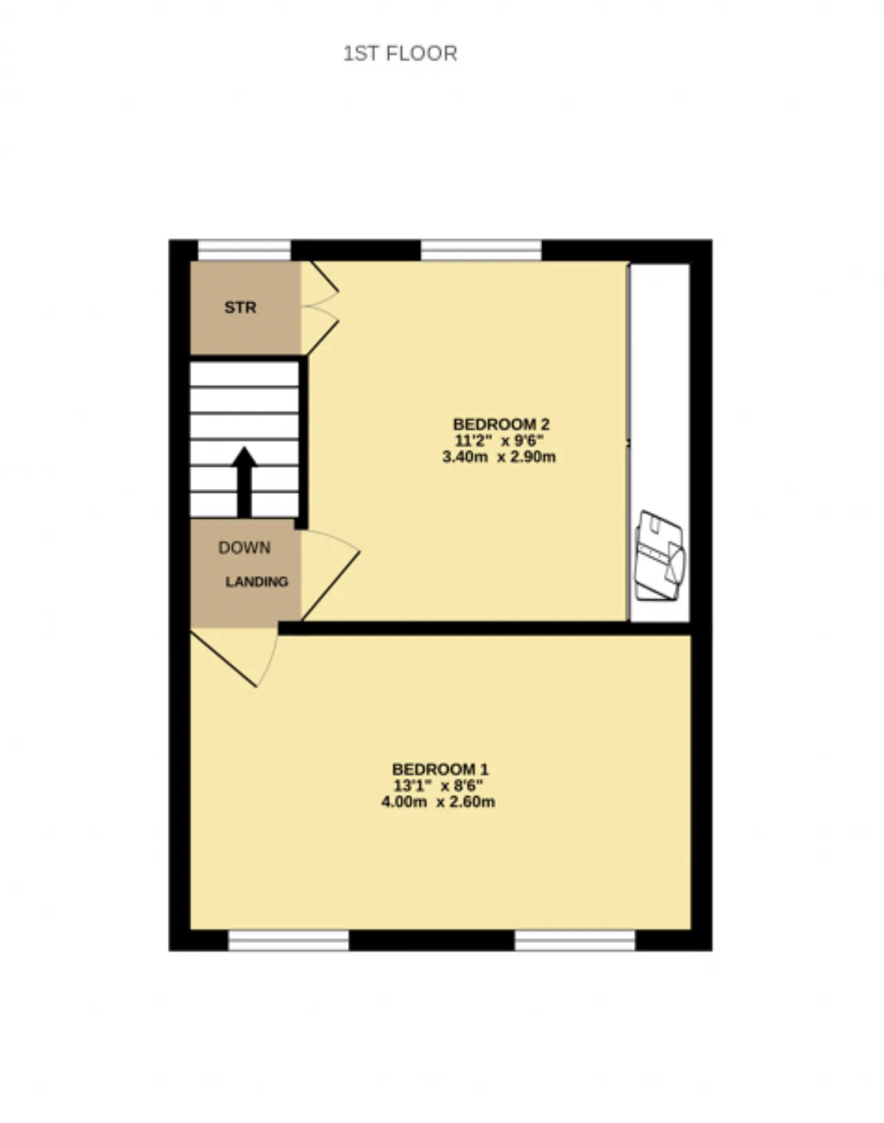 Bedroom 1 2.60m x 4.00m A spacious double bedroom finished with carpet flooring. Two sash windows allow plenty of natural light into the room and are complemented by privacy shutters, creating a bright and comfortable space.