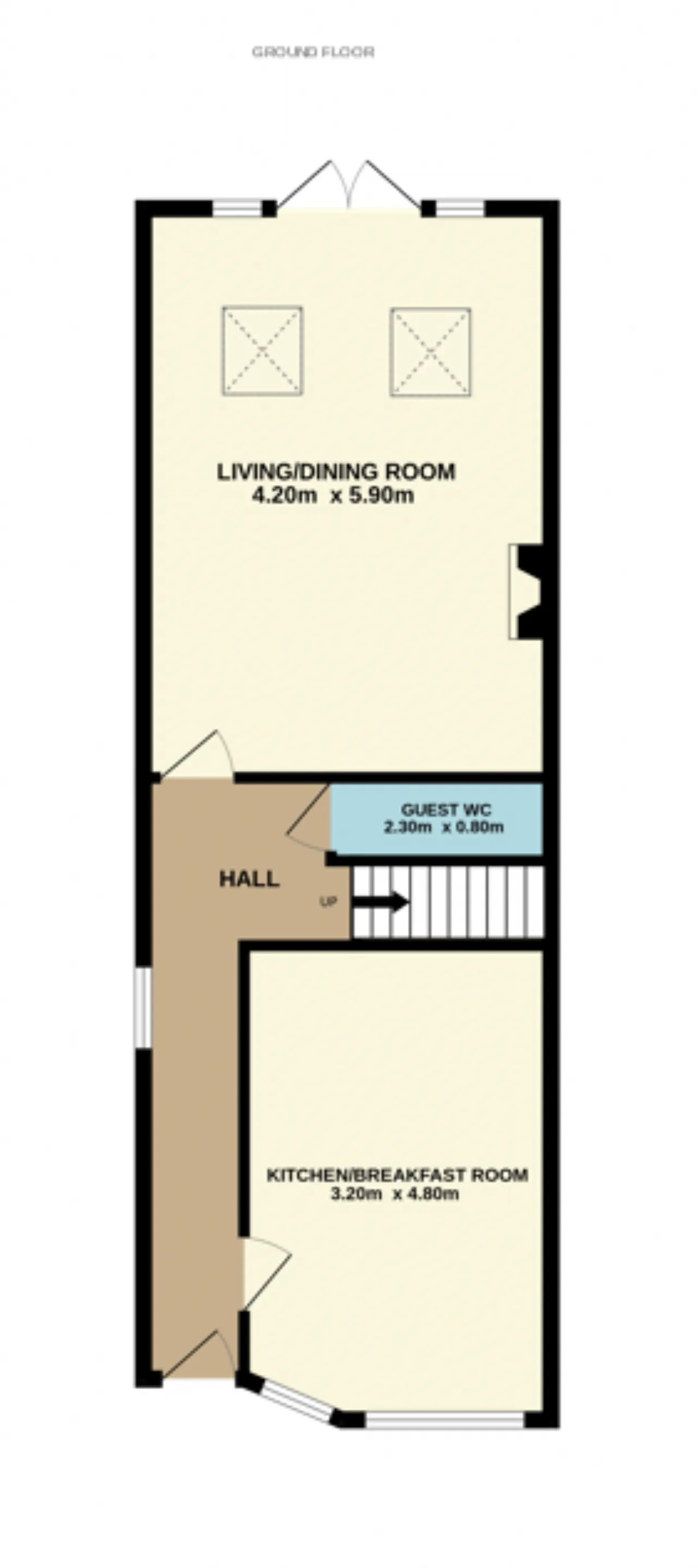 Guest WC 2.3m x 0.9m Wash Hand Basin, WC, Tiled Floor