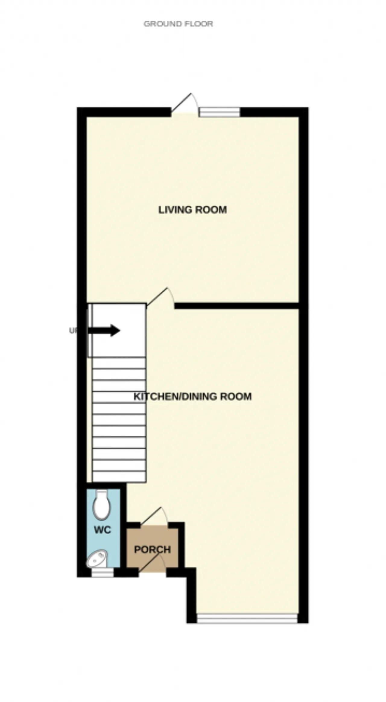 Guest WC 1.50m x 1.15m Tiled floor, WC, wash hand basin with tiled splashback, wall mounted mirror and stained glass window to front