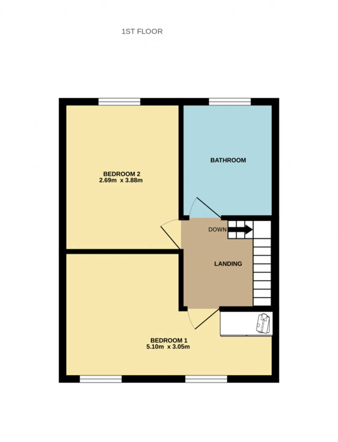 Bedroom 1 5.10m x 3.05m Double room looking over the front garden, with wood flooring and built-in wardrobes.
