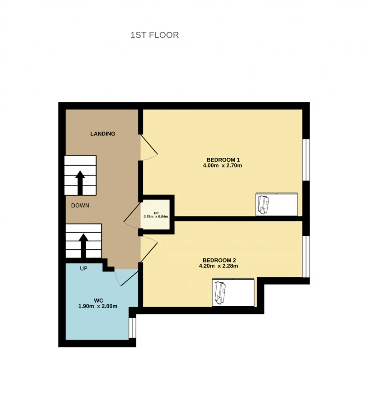Bedroom 3: Spacious twin room with laminate wooden floor, two large velux windows, fitted wardrobes and study area, access to attic space.