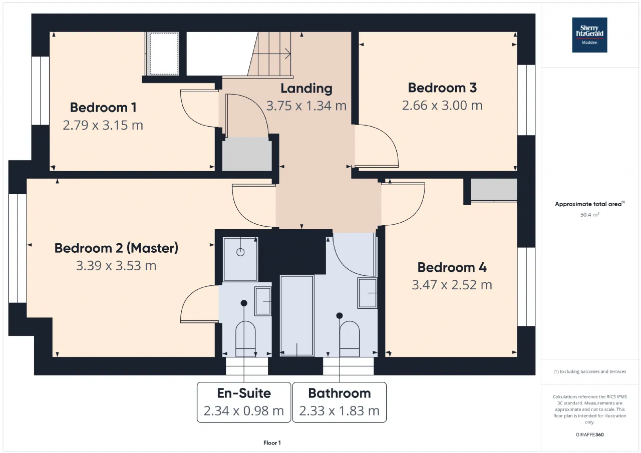 Bedroom 2 - Master 3.39m x 3.53m Front aspect window, fitted wardrobe, carpet flooring - En-suite - 0.98m x 2.34m - Shower, whb, wc, floor to ceiling tiling