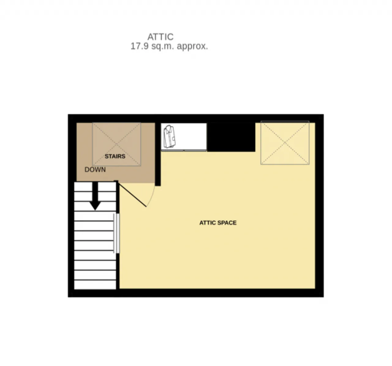 Atttic room: Carpet flooring, timber staircase access, Velux window on landing and at rear of room, eves storage,