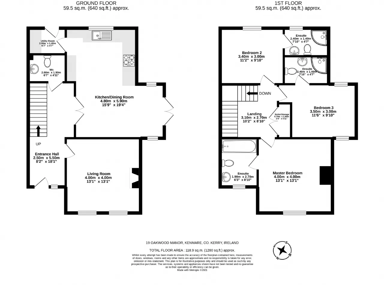 With a total floor area of approximately 1,280 sq. ft (118.9 sq. m), the home offers a bright and well-proportioned layout. Accommodation includes: Spacious living room, Open-plan kitchen and dining area with access to the decking area and garden, utility room and guest WC. Located on the first floor are three generous double bedrooms, all ensuite.