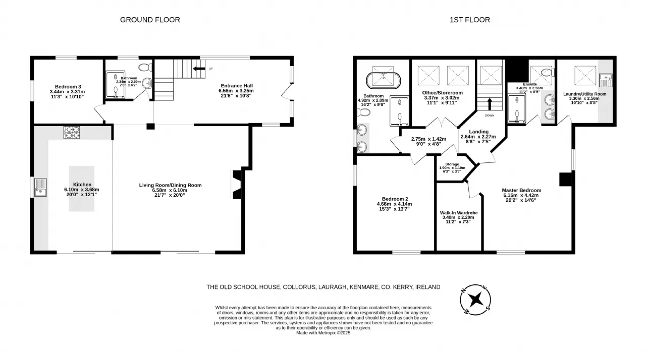 Accommodation is over two floors with an internal floor area of about 215 sq.mt (2,313 sq. ft). The ground floor consists of: Entrance Hall leading onto open plan living room/kitchen/dining room, bedroom and full bathroom. The first floor comprises of 2 bedrooms, (the spacious master bedroom has an ensuite bathroom and large walk-in wardrobe), bathroom, office / storeroom, laundry room.