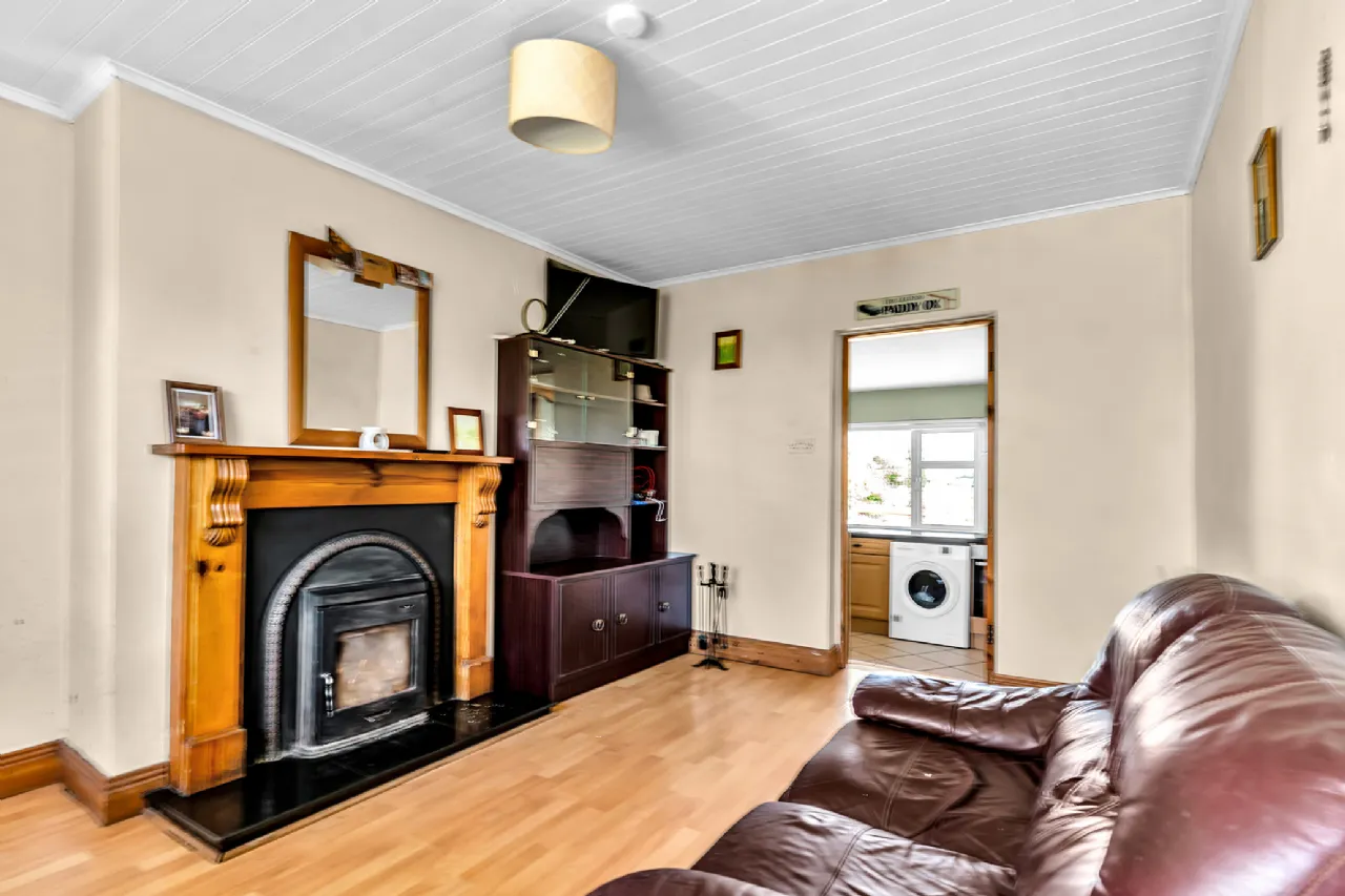 Dining/Living Room 3.394 x 4.533 Feature pine fireplace with solid fuel stove. laminate wooden floor. Wooden ceiling. Curtains and pole.
