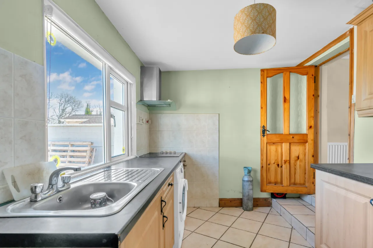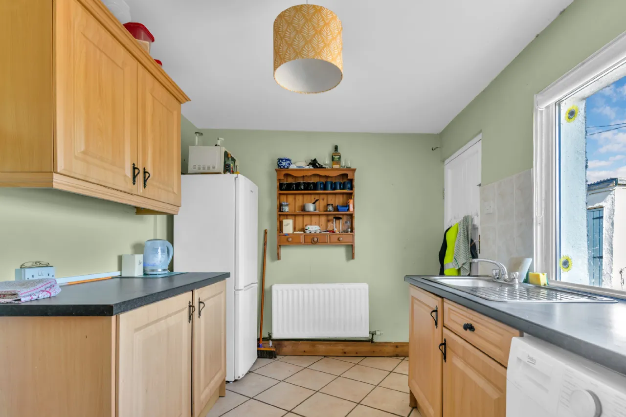 Kitchen 2.532 x 3.526 Fitted floor and wall units. Tiled floor and splashback. Door to rear.
