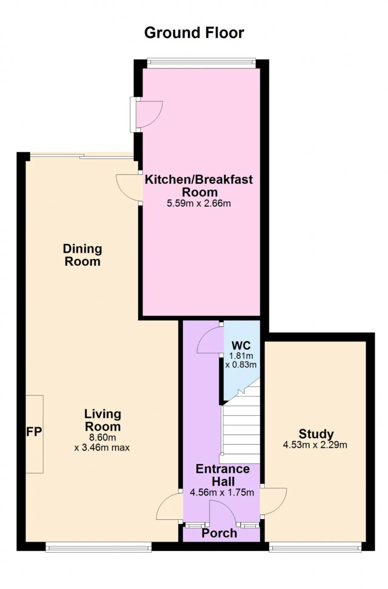 Living / Dining Room 8.60m x 3.46m Large thru lounge/dining area. A feature fireplace with wood surround and cast iron inset and polished granite hearth. Coving to ceiling and ceiling rose. Patio door leading rear garden.