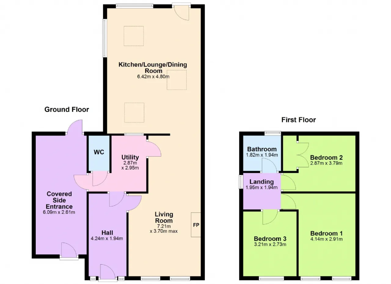 Living Room 7.21m x 3.70m Large extended space with two floor-length windows. Feature fireplace with built-in stove. Coving to ceiling with ceiling rose. Solid wood flooring throughout. Archway leading into kitchen/dining/living area.