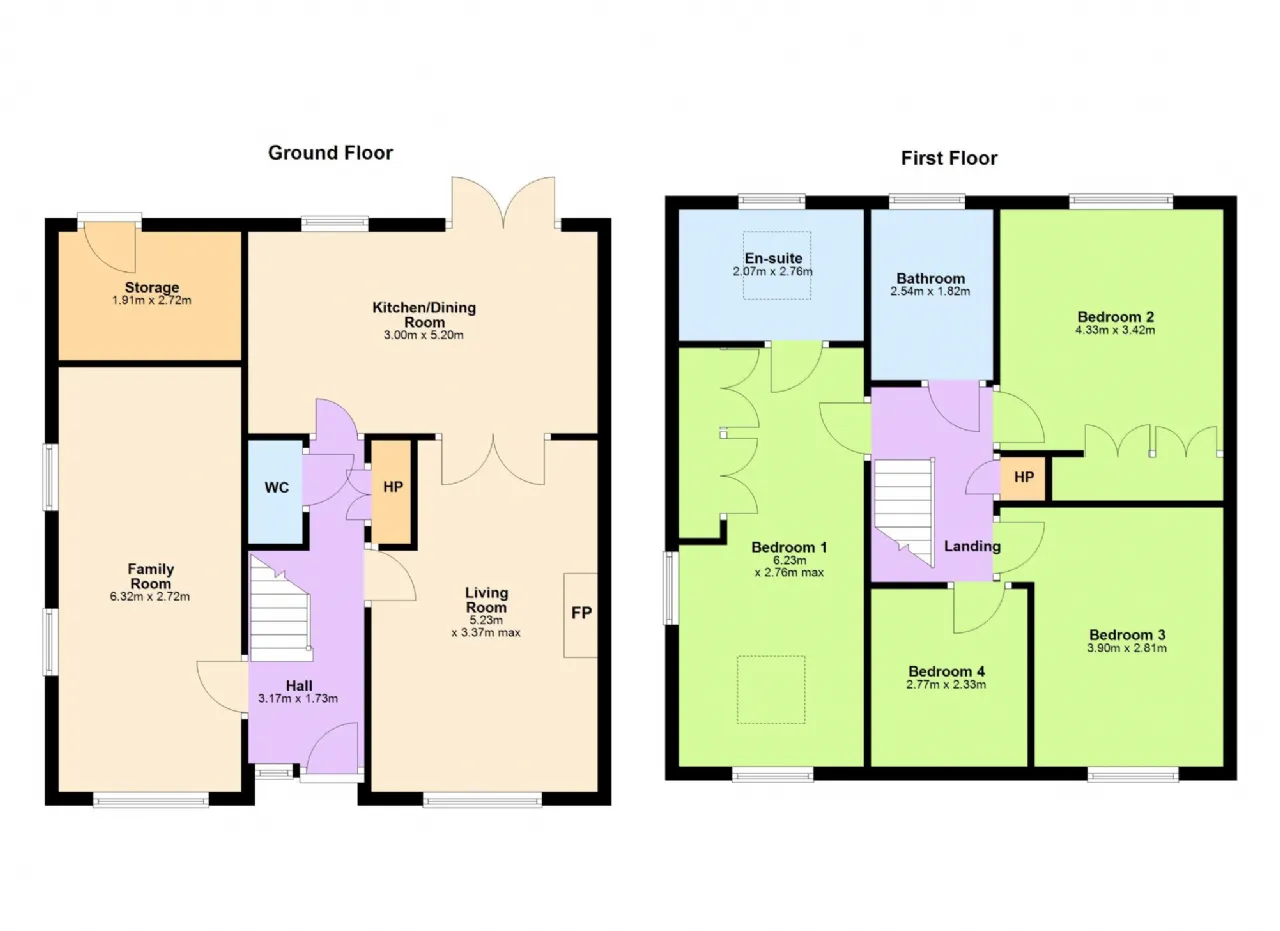 The ground floor comprises a welcoming entrance hall, a bright front living room, a second reception/family room to the side, a guest WC, and a good sized kitchen/dining area with access to the rear garden. Upstairs, there are four bedrooms—including a principal bedroom with ensuite—and a well-appointed family bathroom.