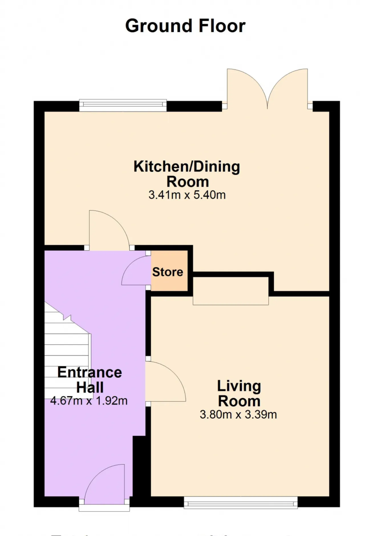 Kitchen 3.41m x 5.40m High quality kitchen with tiled splash back area, stainless steel sink, oven, hob and extractor fan. Tiled wooden effect flooring. Recessed lighting. French double doors leading to garden area.