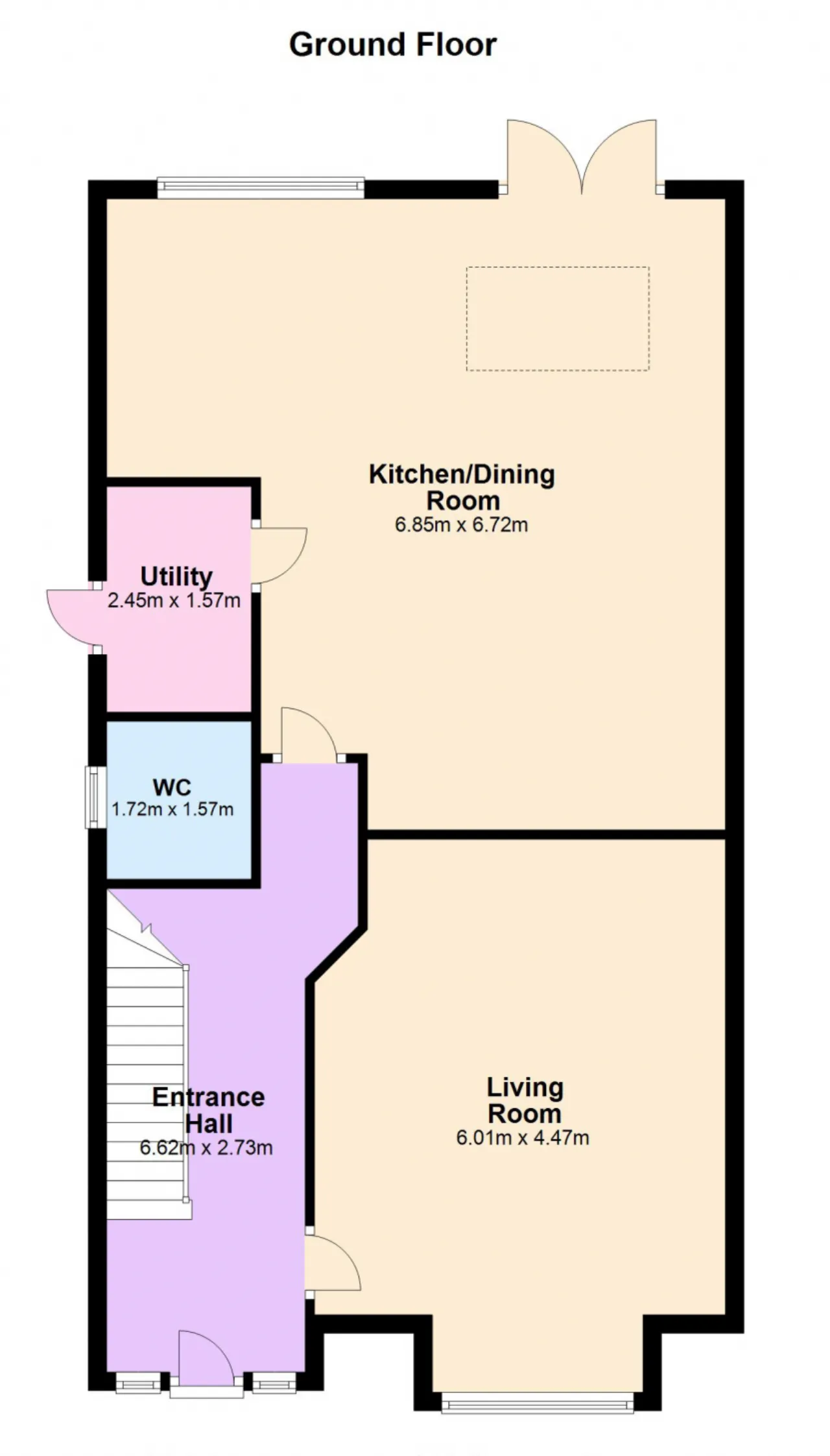 Kitchen / Dining Room 6.85m x 6.72m Expansive open space with tiled flooring. A large velux window floods the room with natural light. Contemporary fitted kitchen units with breakfast counter, complete with quartz countertops. French doors leading to rear patio.