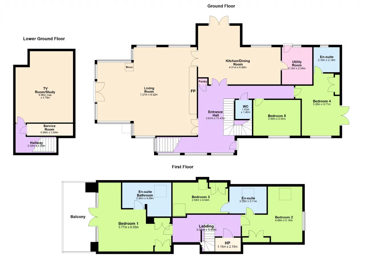 Guest WC 1.60m x 1.40m Fully tiled floor to ceiling. With shower enclosure, toilet, whb & heated towel rail.