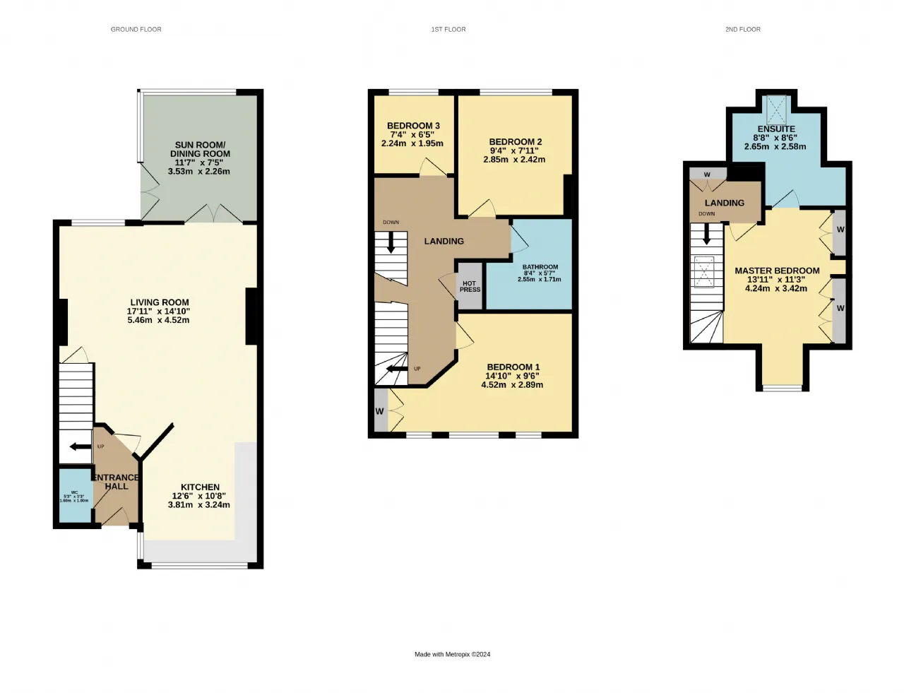 The spacious and light-filled accommodation extends to 112 Sq. M. / 1,206 Sq. Ft,. approx. spanning over three levels. The accommodation at ground floor level comprises: entrance hall with stairs to first floor, guest wc, a spacious and bright open plan kitchen/living room and sun room/dining room with dual aspect windows. The layout on the first floor comprises: landing area, three bedrooms and a family bathroom. The layout at second floor level comprises: landing area and master bedroom complete with en-suite bathroom.