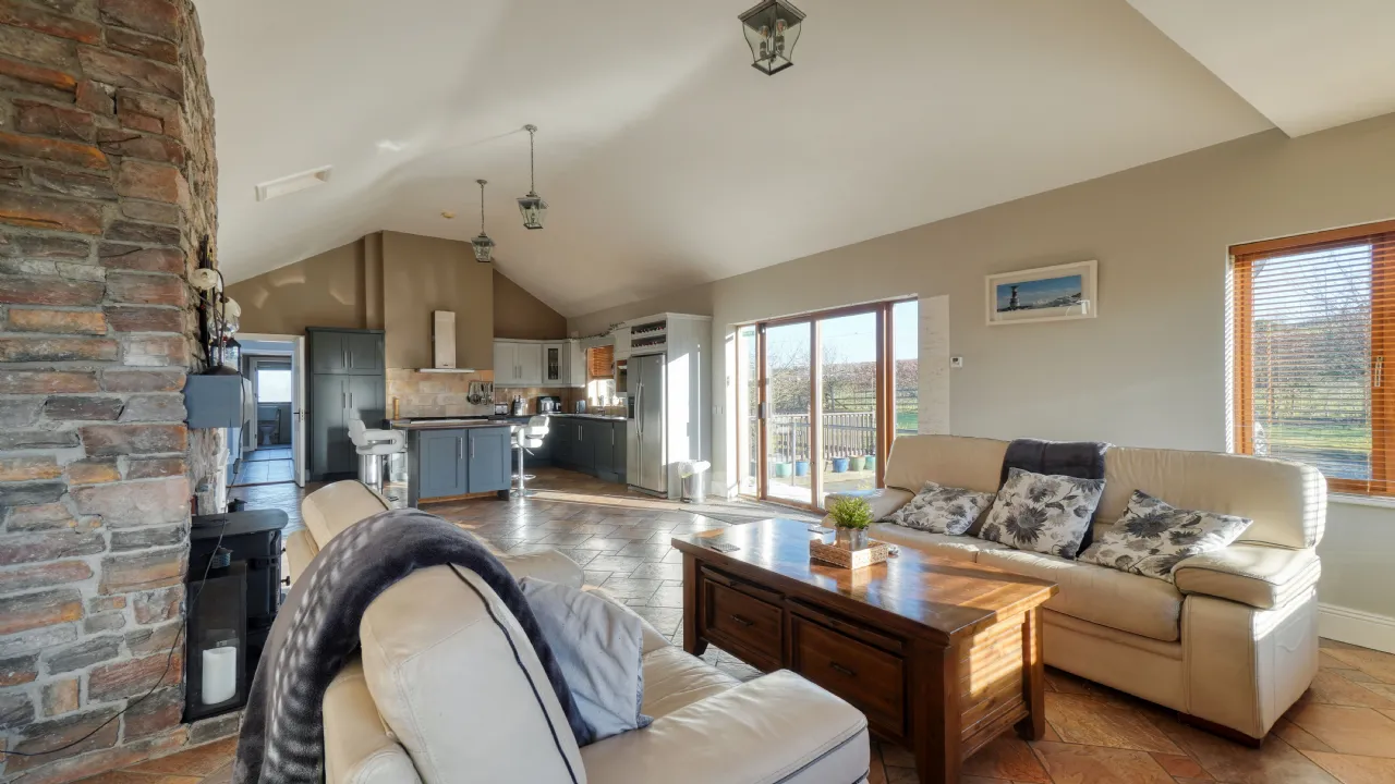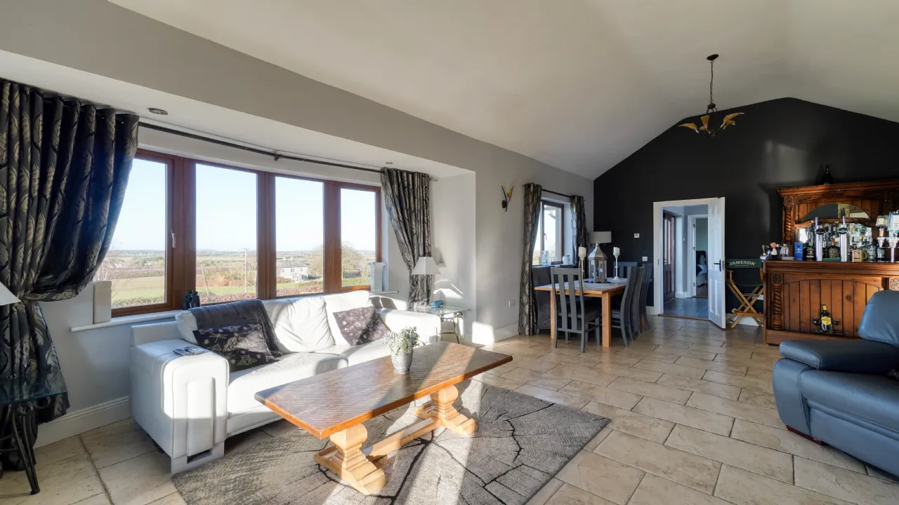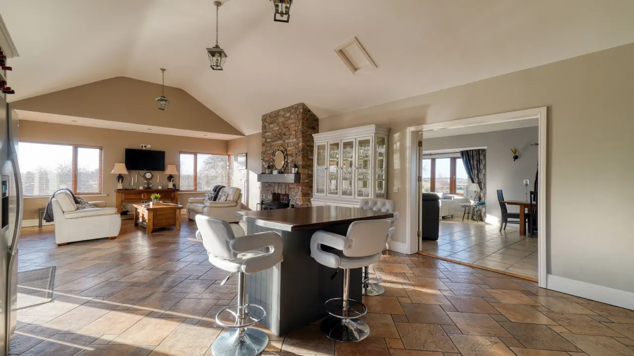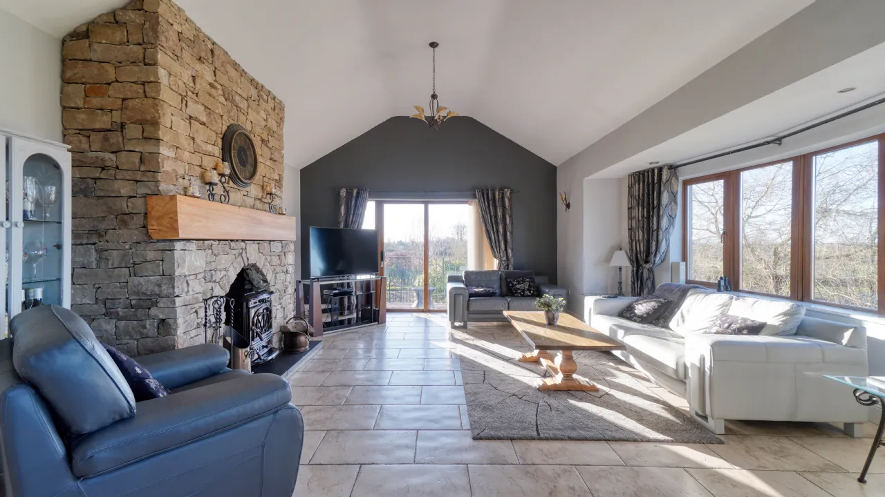 As you approach via the private driveway, the home's striking façade, featuring natural stonework and expansive windows, immediately sets the tone for the sophistication within. The main entrance welcomes you to a spacious and bright hallway, leading to the heart of the home a beautifully designed open-plan kitchen, dining, and living area, where vaulted ceilings and large picture windows flood the space with natural light. The country-style kitchen, complete with bespoke cabinetry, an island unit, and modern appliances, flows effortlessly into a charming living area, enhanced by a rustic stone fireplace and a solid-fuel stove, creating a warm and inviting ambiance. French doors lead to an outdoor balcony, the perfect spot for morning coffee while taking in the panoramic views.