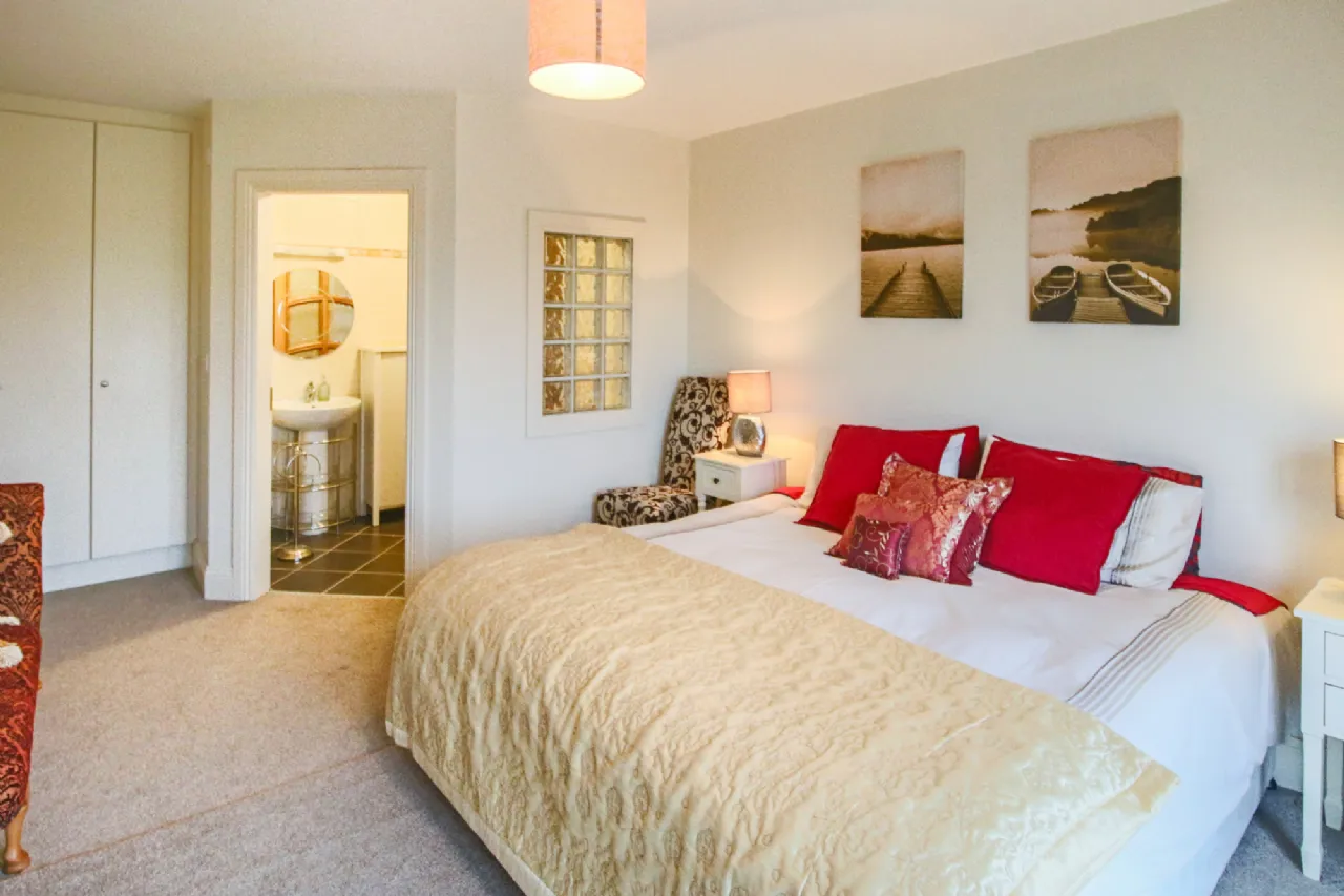 Bedroom 1 4.47m x 3.85m Carpet, feature wallpaper, glazed white oak doors x3, glazed door with side lights providing access to Juliet balcony with lake and mountain views.