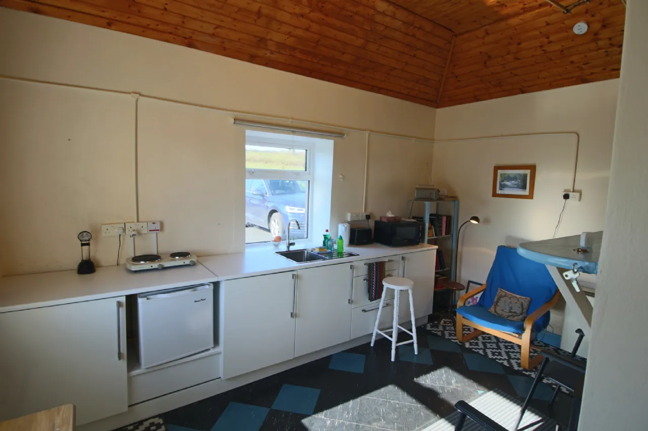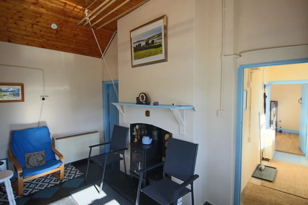 Living Room / Kitchen 4.34m x 3m Vinyl floor tiling, original chimney breast feature with solid fuel stove on slate hearth, traditional high ceiling, fitted base cupboards with worktops, good natural light from two windows with blinds, electric storage heater