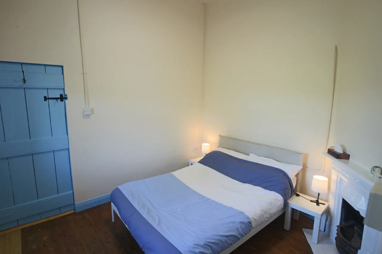 Bedroom 2 2.96m x 2.12m Wood floor, fireplace, window with blind, front garden views