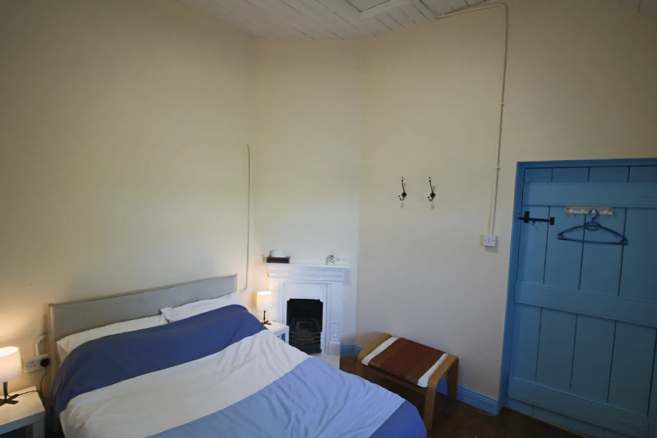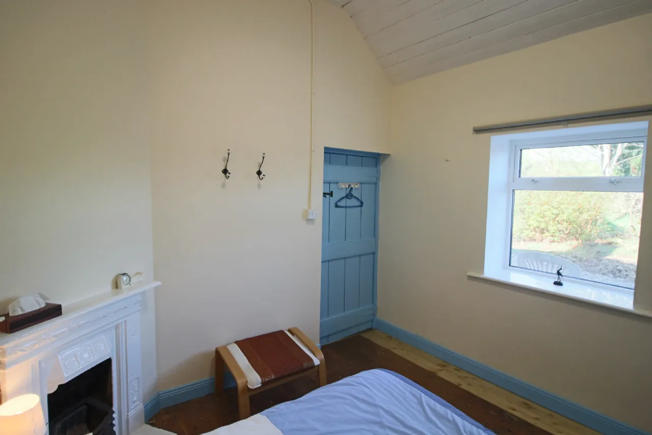 Bedroom 1 3.17m x 2.86m Wood floor, cast iron fireplace, window with garden views, blind