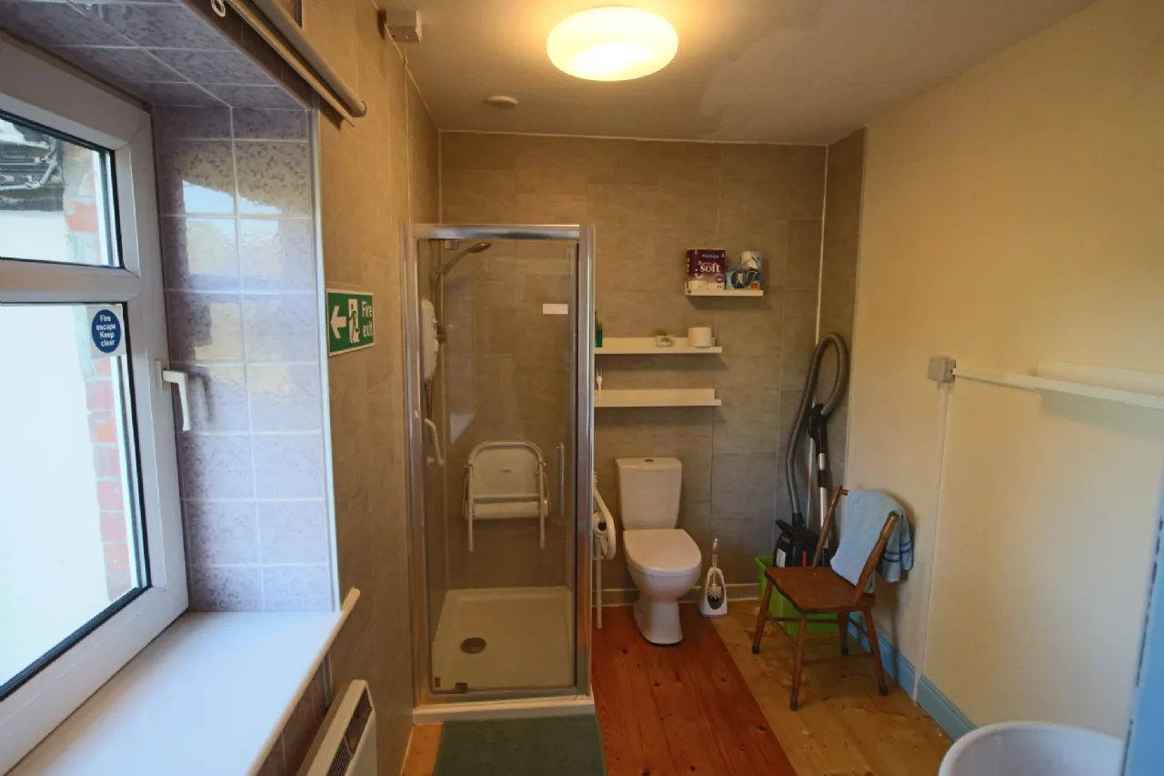 Bathroom 2.87m x 2m Wood floor, electric panel heater, window with blind, Triton T90 electric shower, chrome & glass enclosure, wall tiling, shaver point & light, wc & whb