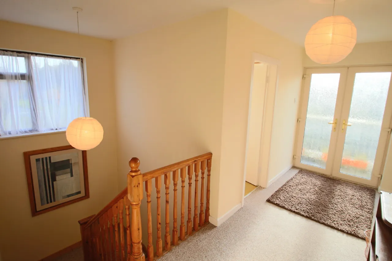 First Floor Landing 4.51m x 1.67m Double doors to balcony, carpet, feature ceiling lights, access to roof space.
