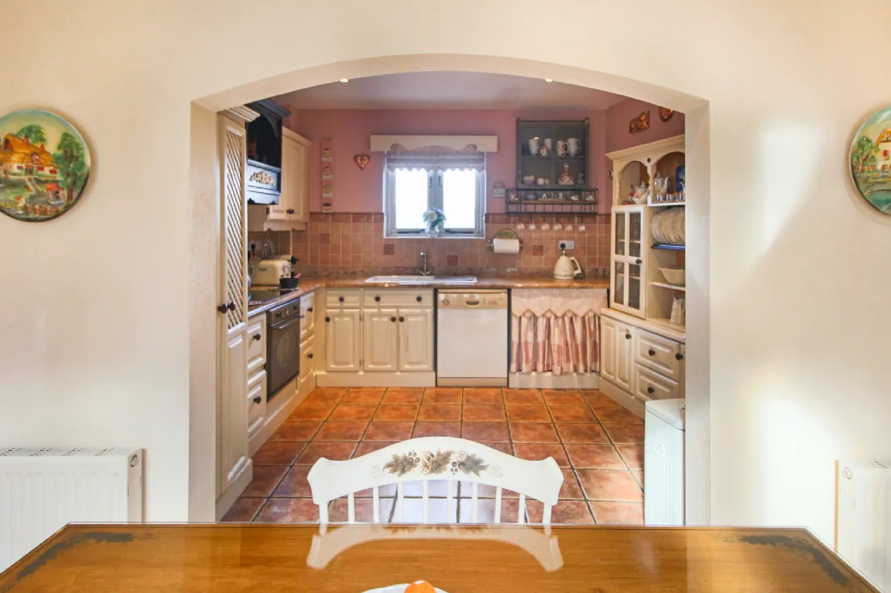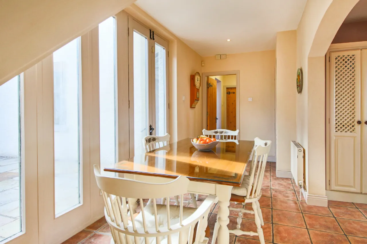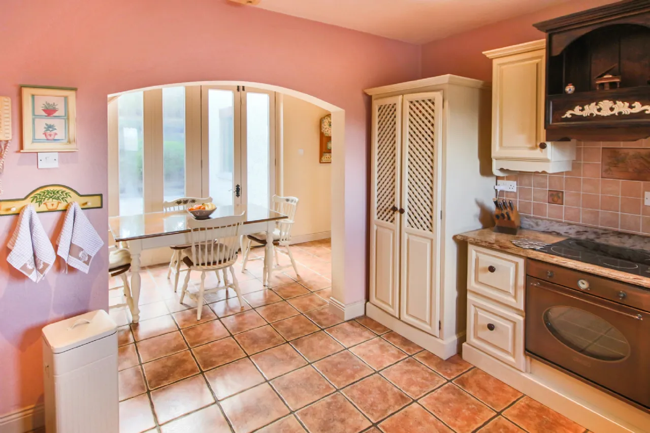 Open Dining Area 3.8m x 2.1m Ceramic 'flag' floor tiling, glazed double doors with side lights out to stone patio with south-easterly aspect, downlights, radiator.