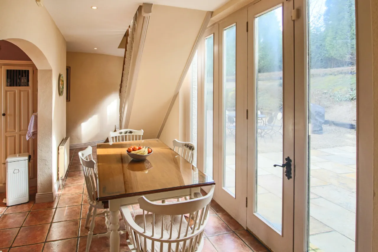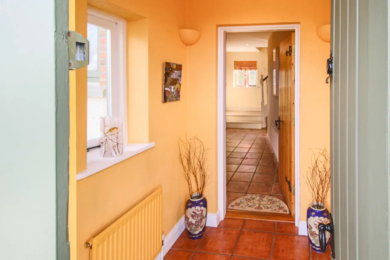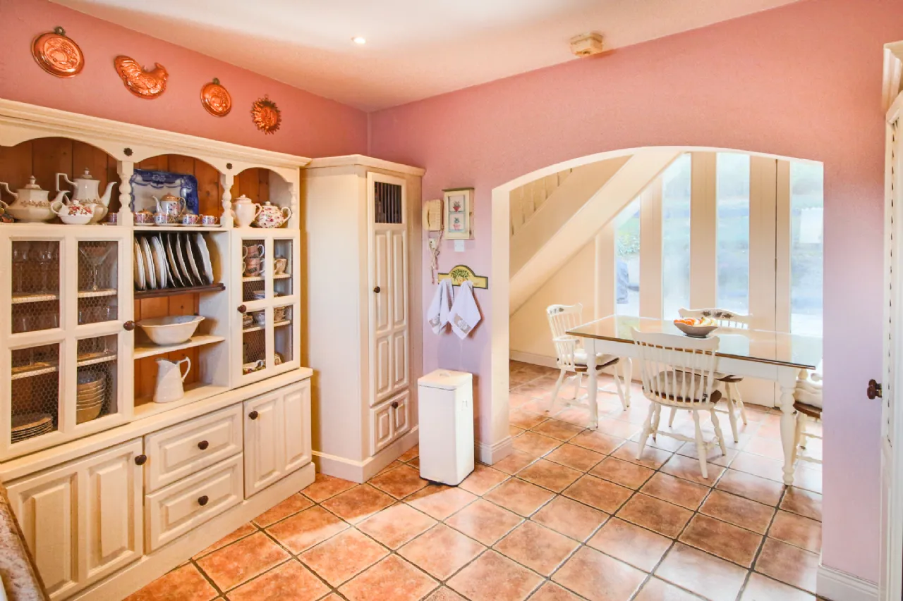 Open Dining Area 3.8m x 2.1m Ceramic 'flag' floor tiling, glazed double doors with side lights out to stone patio with south-easterly aspect, downlights, radiator.