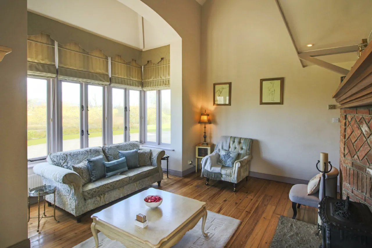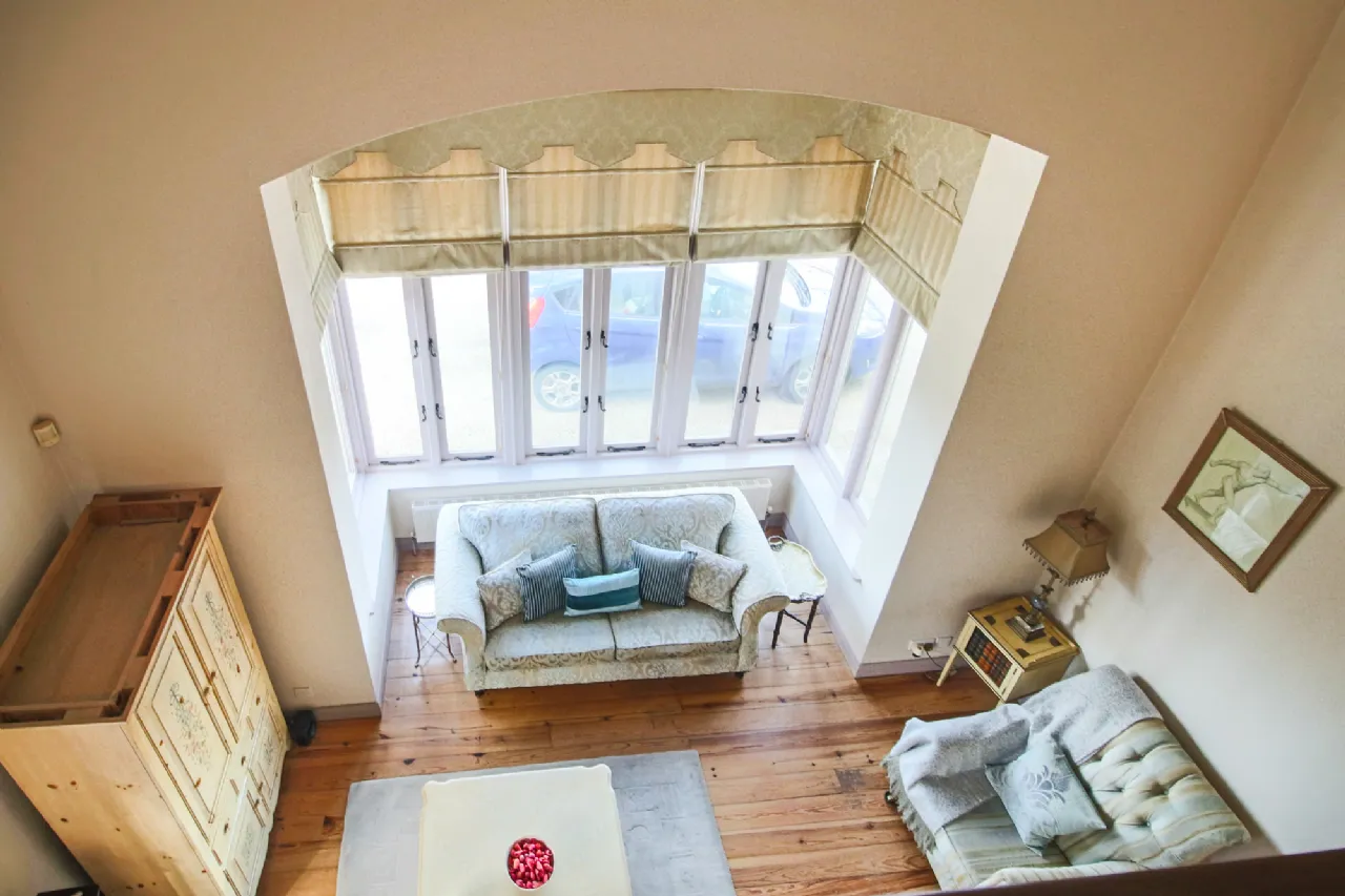 Living Room 5m x 4.61m Double height space with open gallery over, T&G reclaimed wood floor, solid fuel stove on 'slate' hearth with handmade brick fire surround, box bay window feature and tall portrait window with Roman blinds & pelmets, downlighters, radiator.