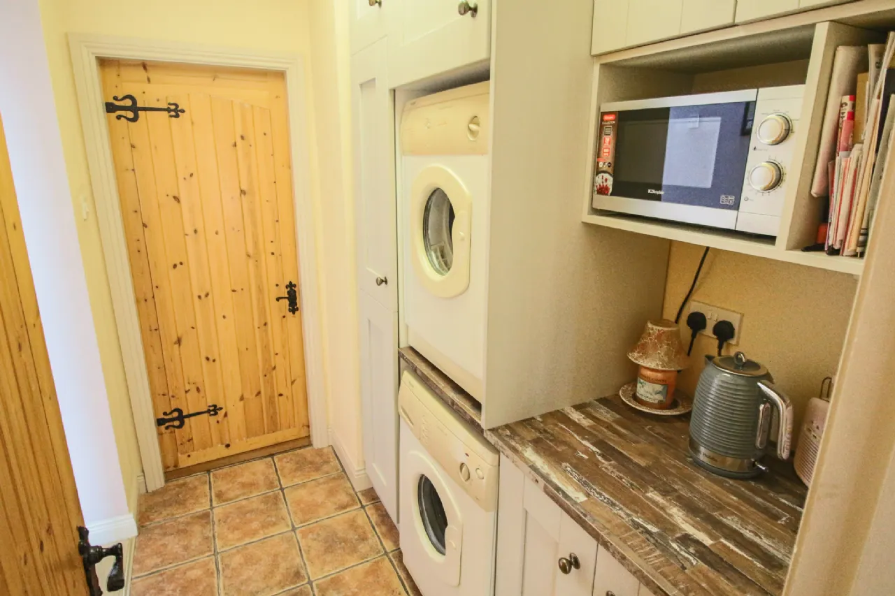 Utility Room 2.33m x 1.26m Fitted units with stacked Hotpoint washer & dryer.