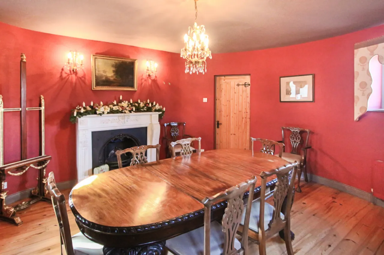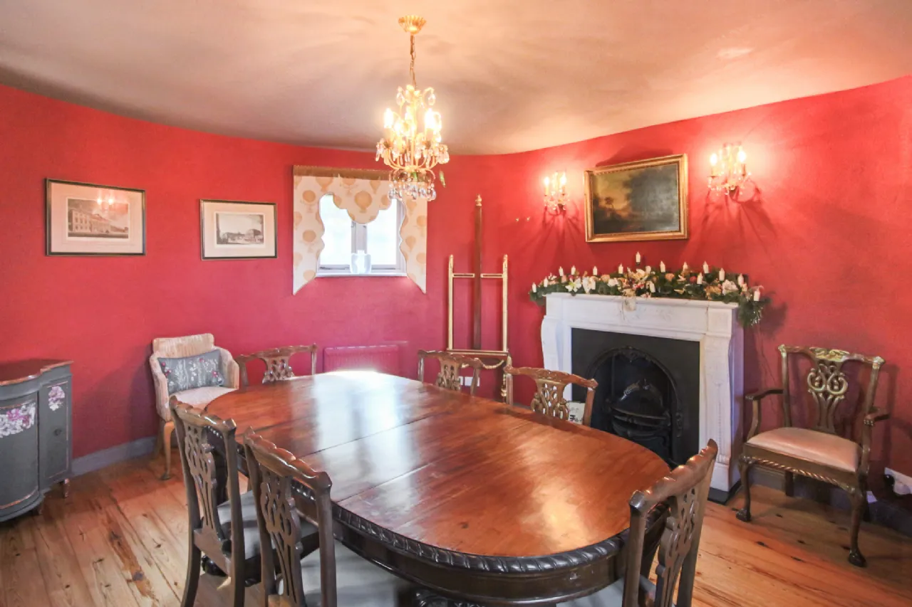 Reception/Dining Room 5.38m x 5m Round room with Reclaimed flooring, ornate marble fireplace with cast iron inset and grate, granite hearth, wall sconces, windows x2 with bespoke fabric braided pelmets, radiators x3, traditional sheeted doors and ironware, chandelier light fitting.