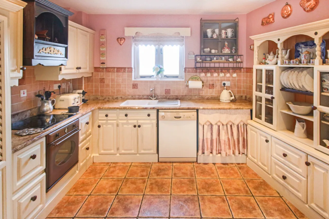 Kitchen 3.73m x 2.88m Handmade painted base and cupboard units with granite worktop and upstand, tiling to wall, ceramic sink unit with chrome faucet, Hotpoint dishwasher, ceramic hob and Smeg oven, Zanussi fridge freezer, wood pelmet and roman blinds, direct view of Sliabh an Iarainn.