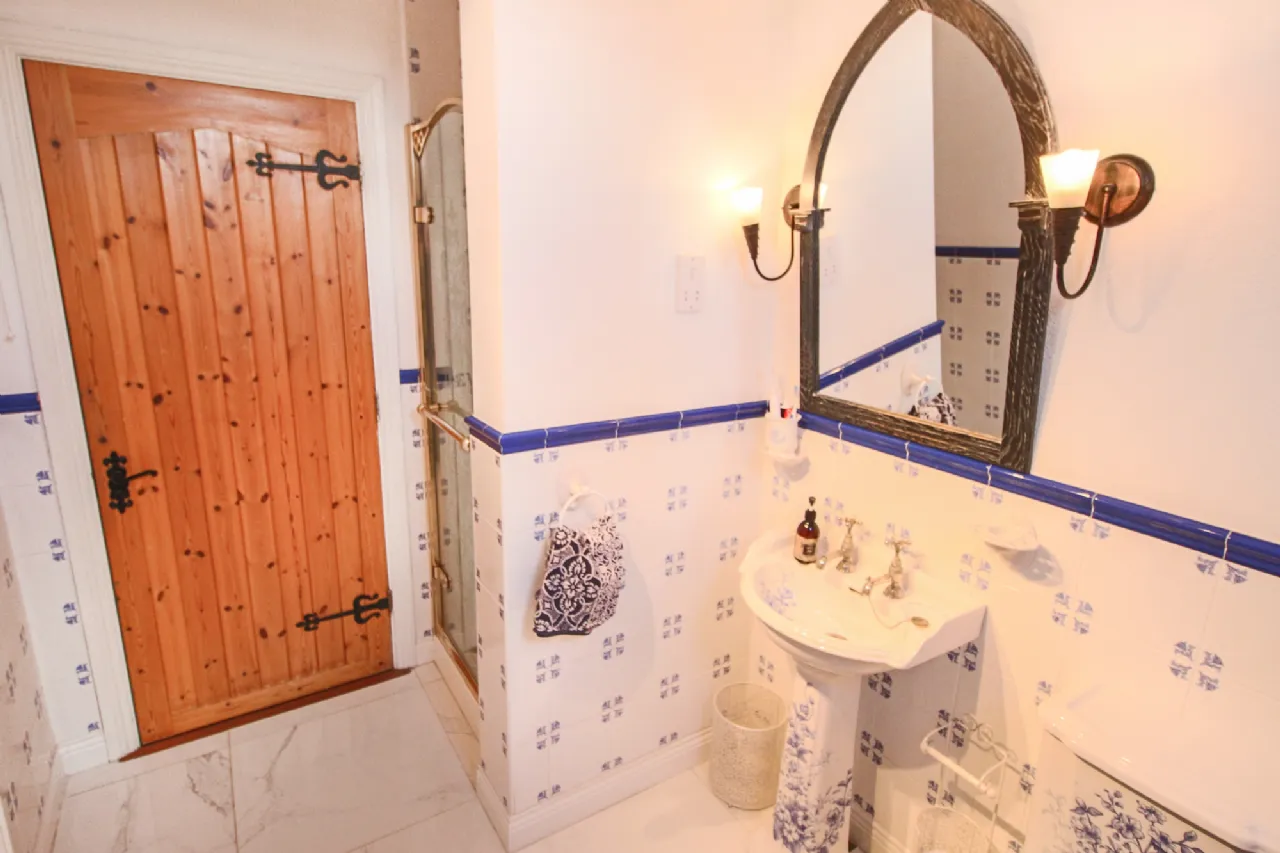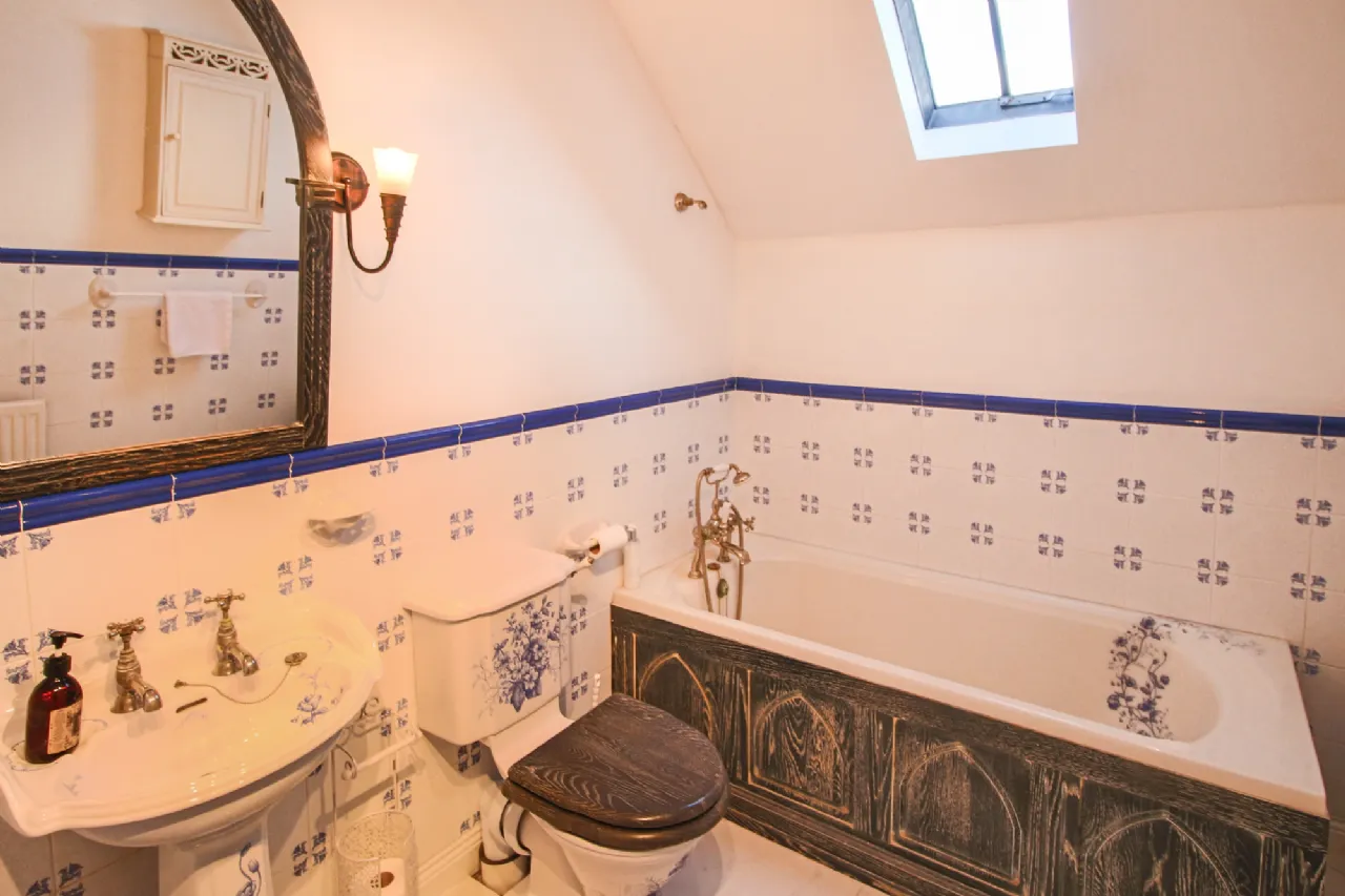 Bathroom 3.31m x 1.98m Tiling to floor and wall, ornate ceramic bath, wc & whb with floral motif, wood panel to bath with mixer tap and hand spray, wall lights, mirror and cabinet, shower enclosure with Triton T90 shower.