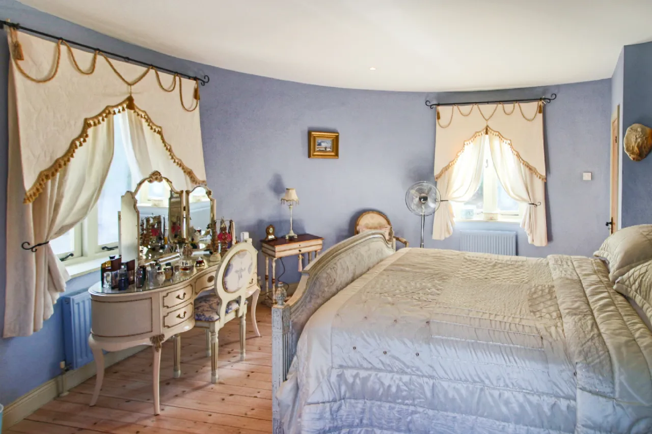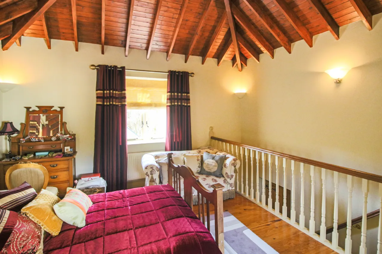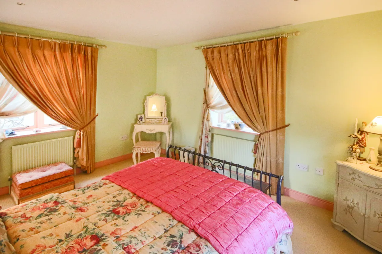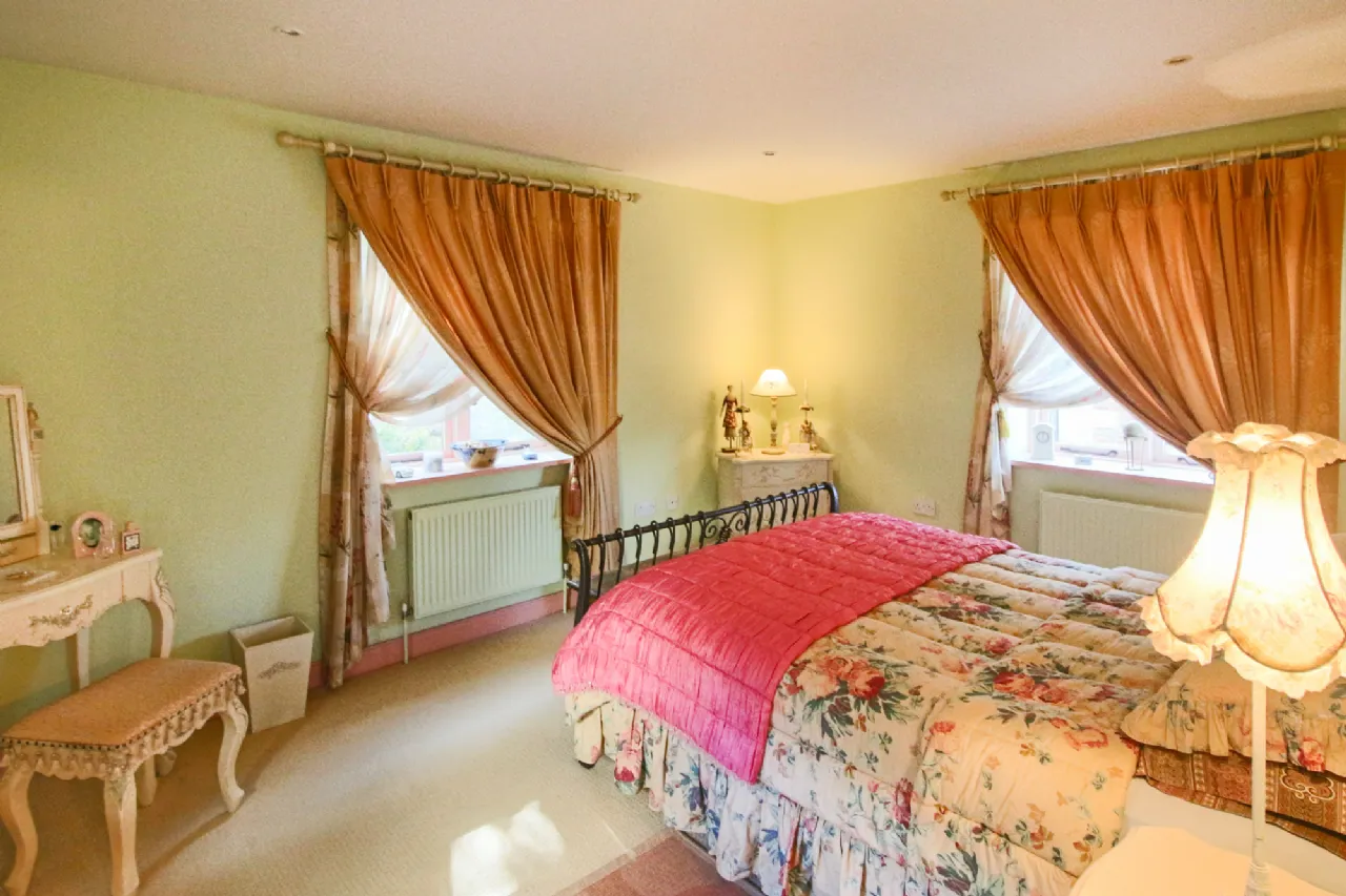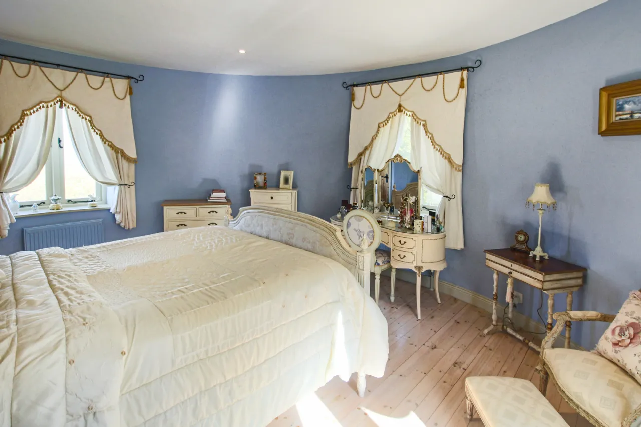 Bedroom 4 5.16m x 4.1m Reclaimed wood floor, walk in closet, windows x3 with curtain poles & drapes, radiators x2, telephone point, downlights, lovely water and mountain views.